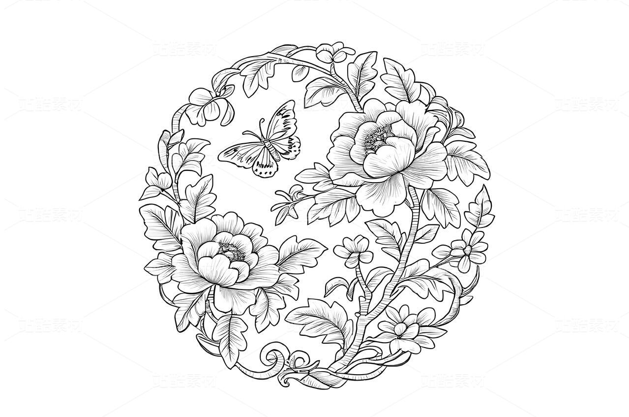 传统纹样-蝶恋花线稿 蝴蝶 荷花 菊花