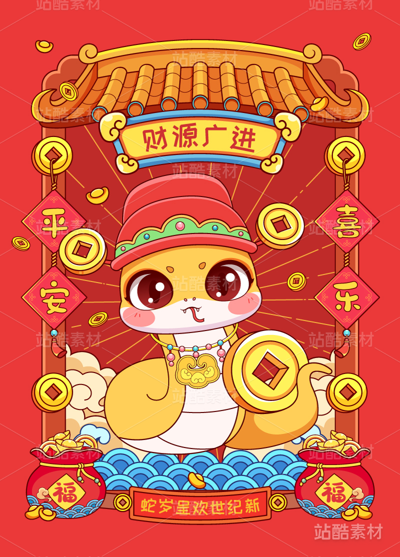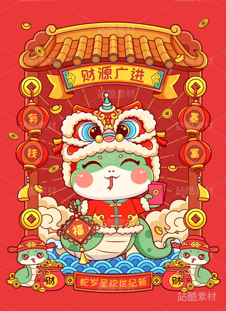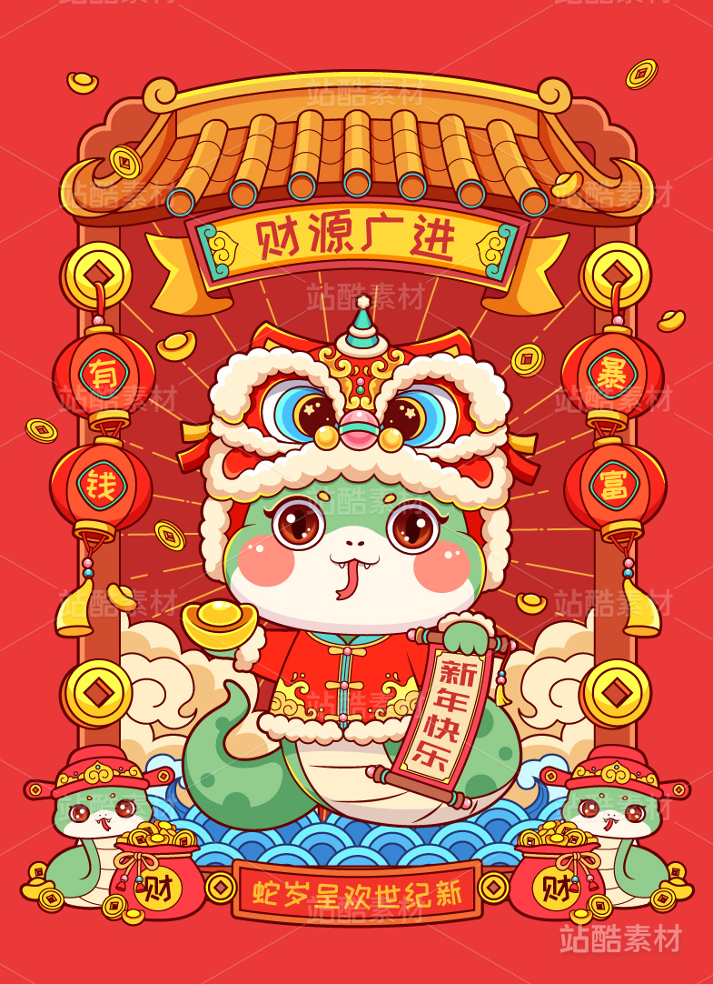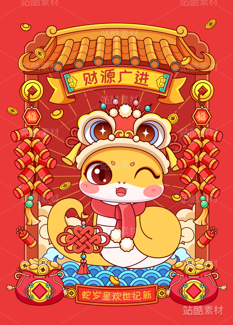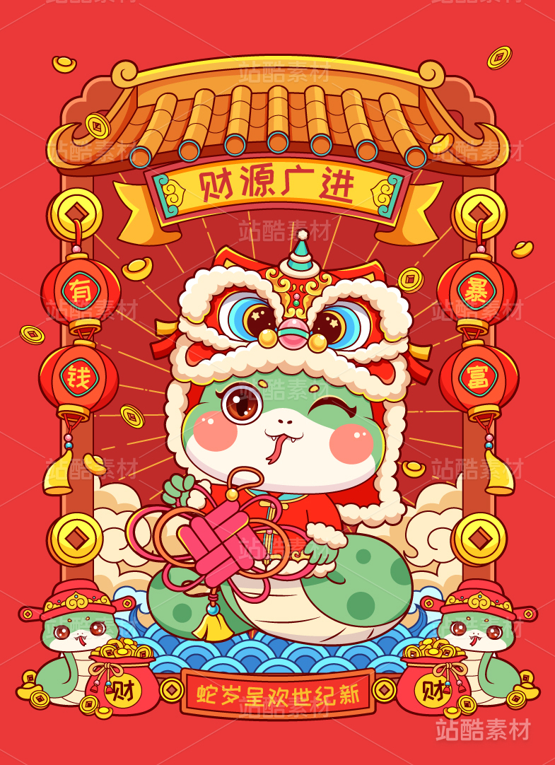 蛇年头戴醒狮帽卡通蛇矢量插画