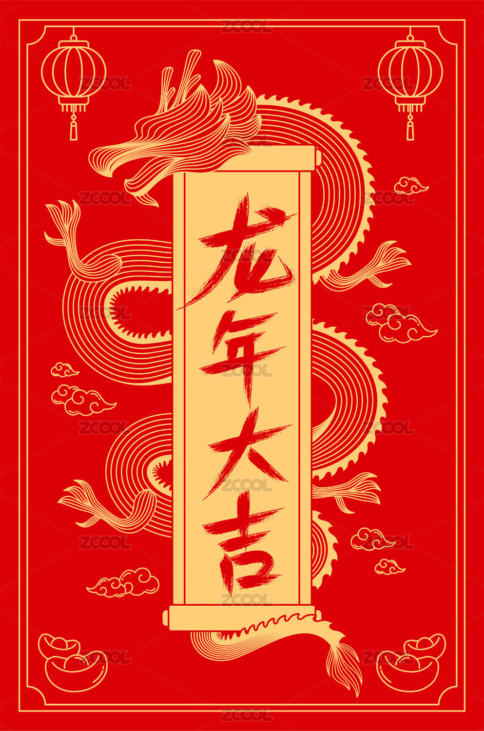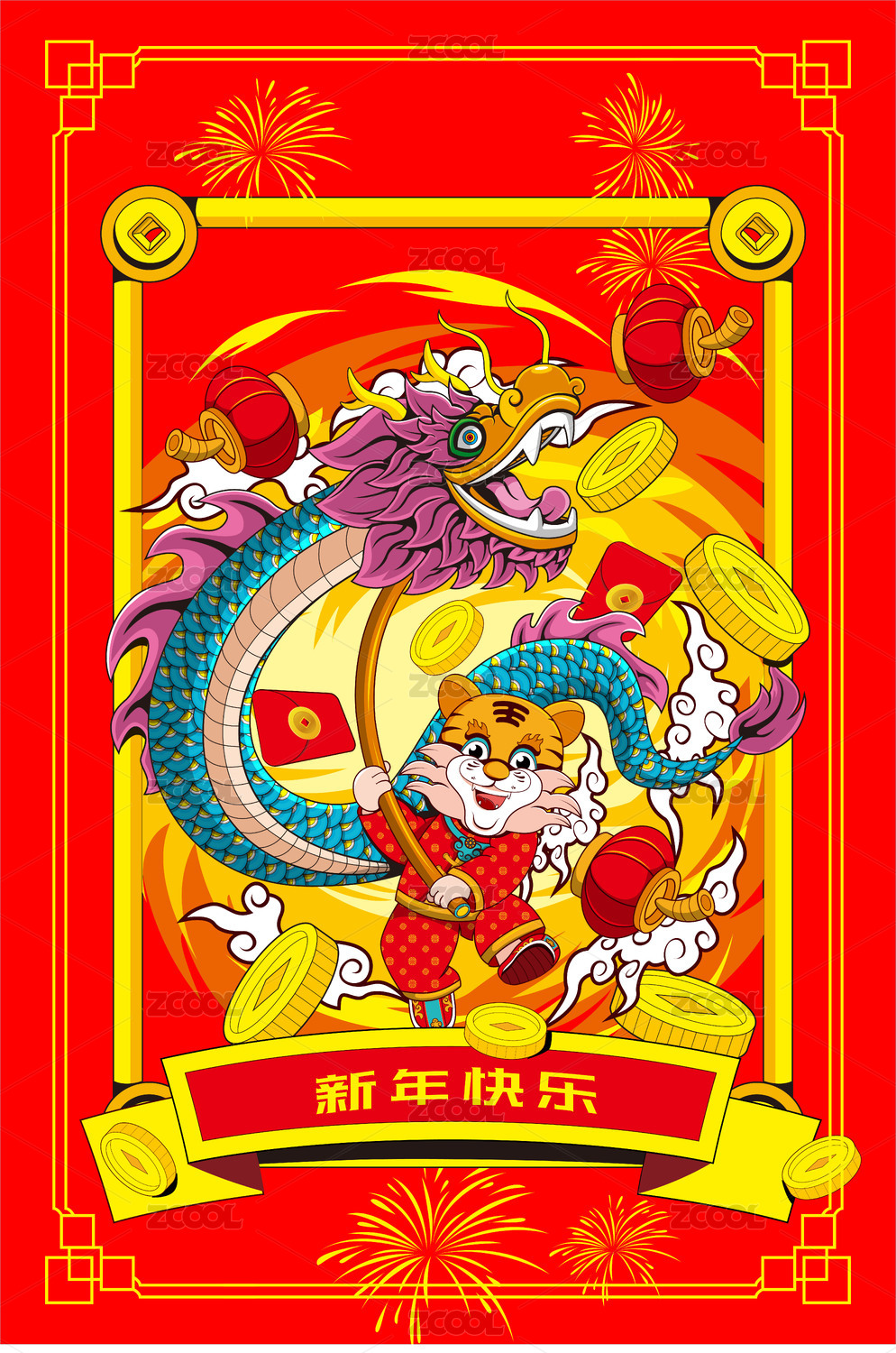 拜大年锦鲤开运牡丹花开春节矢量插画海报