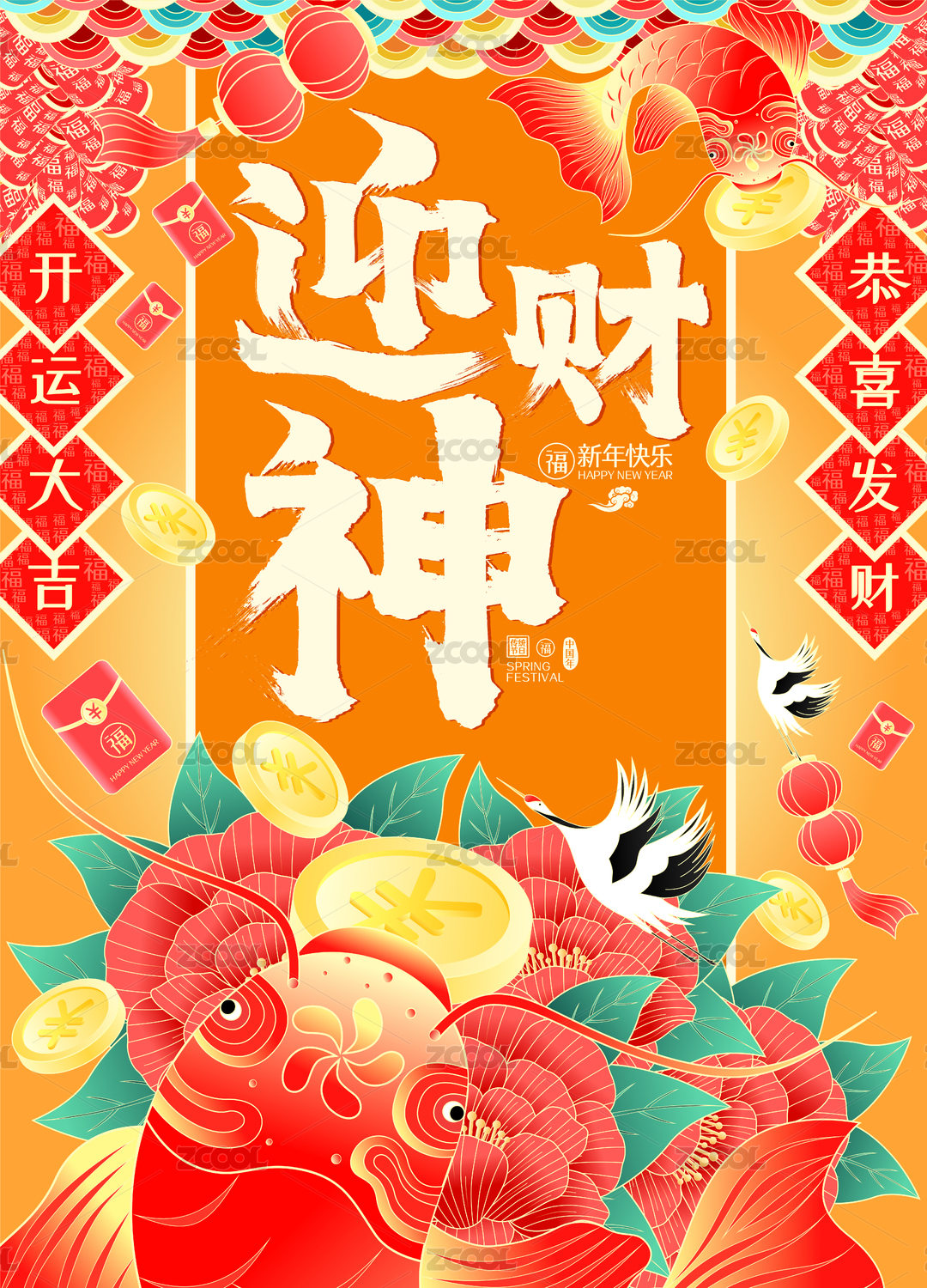 春节迎财神牡丹花开锦鲤开运矢量插画海报