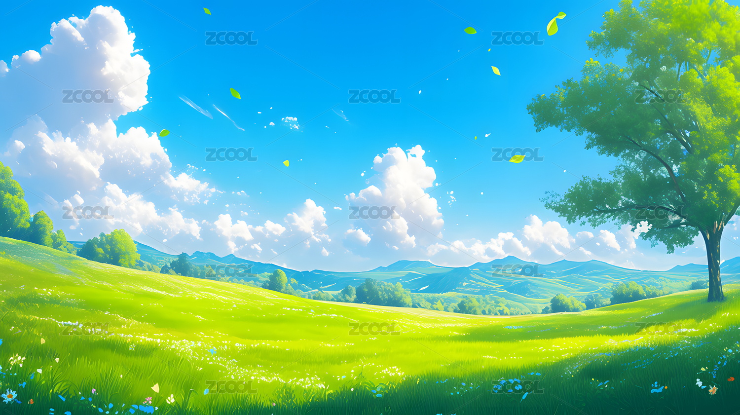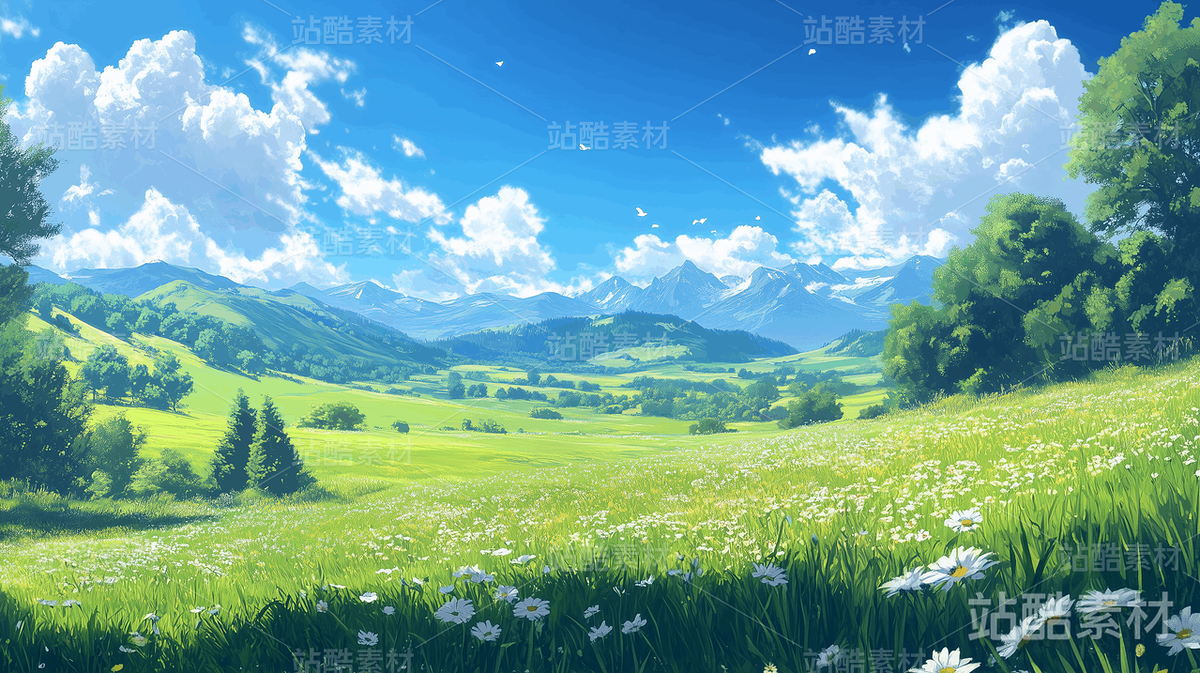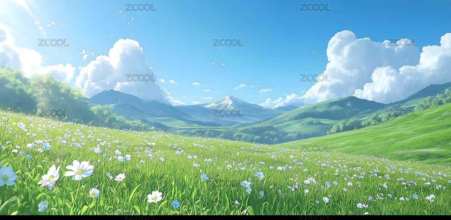 夏日阳光下的山野,绿草如茵,野花盛开。