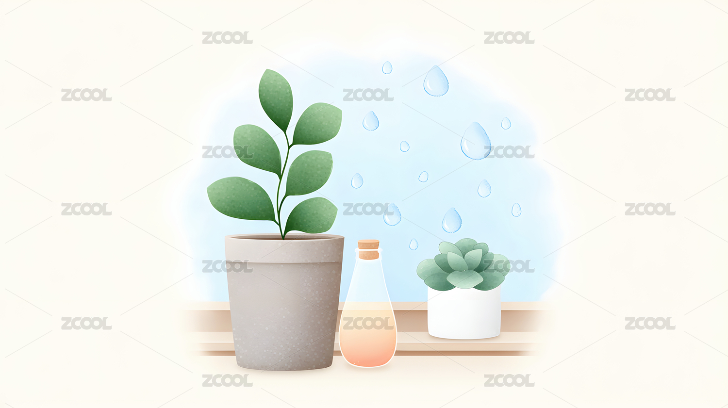 室内植物与花盆的温馨插画
