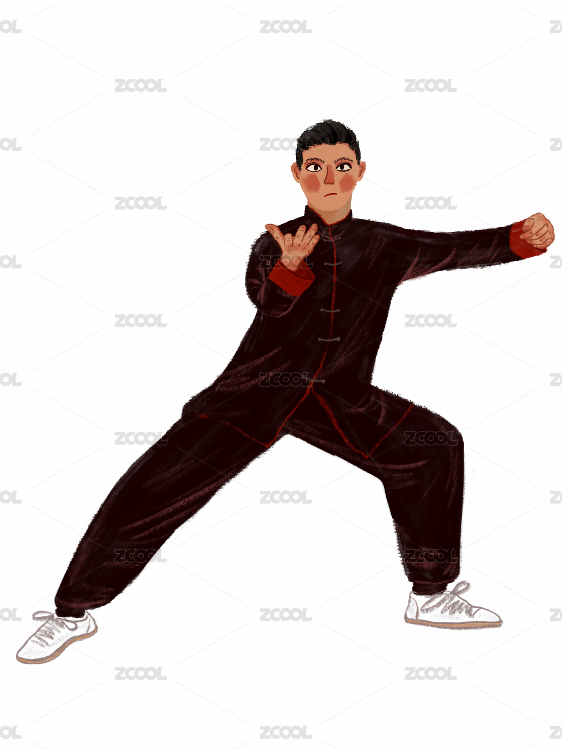 一个穿着练功服的男人在打太极拳,国潮风插画,中国功夫