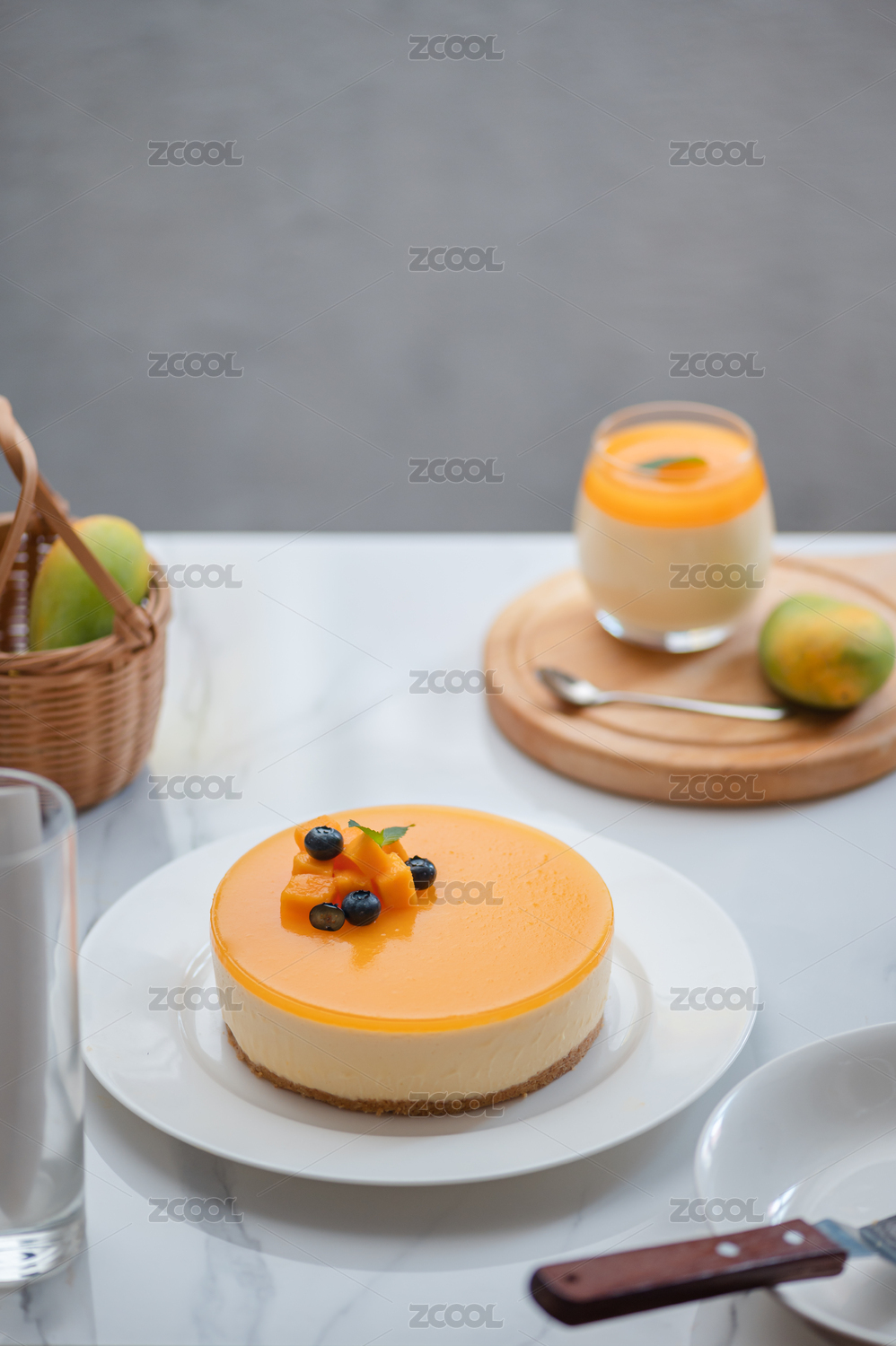 用芒果和蓝莓装饰的圆形奶油生日蛋糕