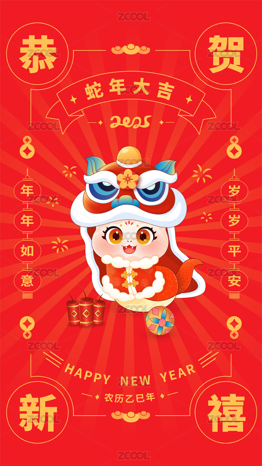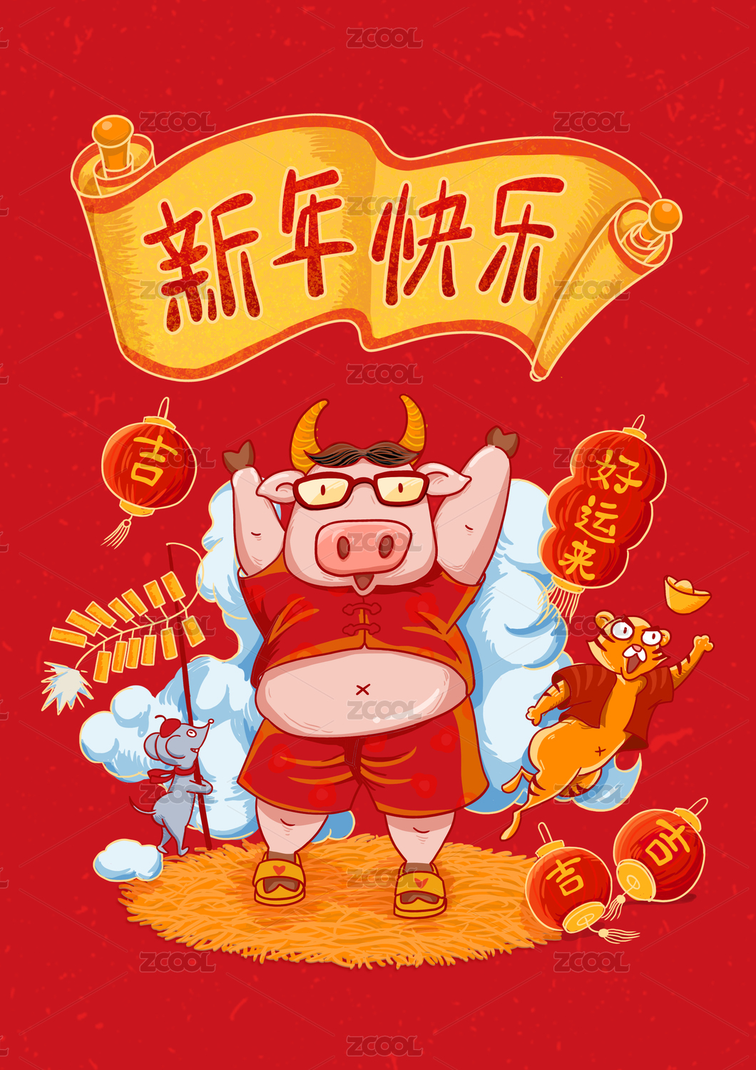 新年快乐春节牡丹锦鲤开运赐福矢量插画海报