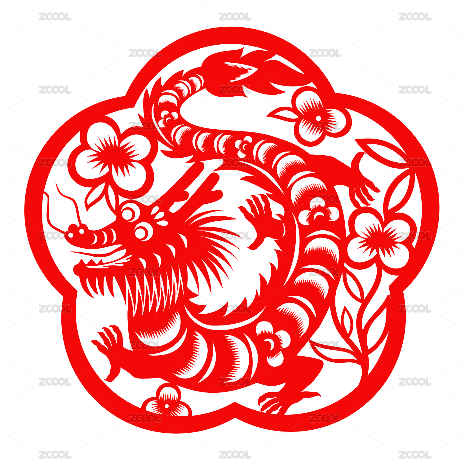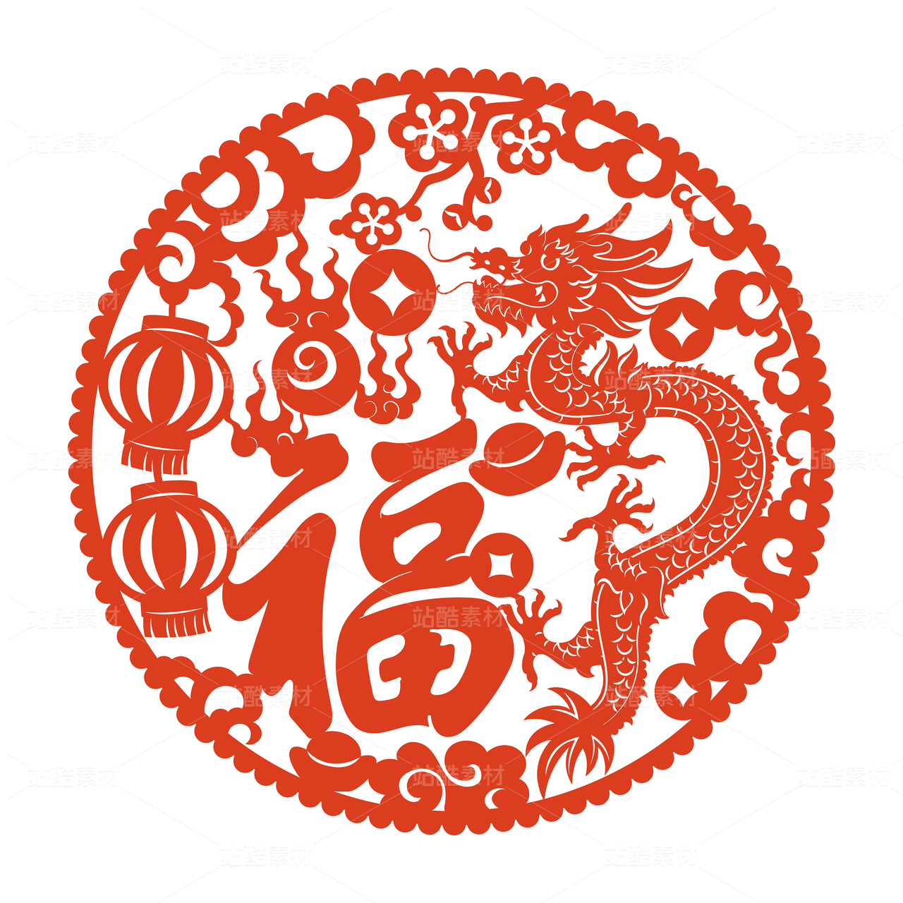 龙年春节十二生肖红色圆形剪纸元素