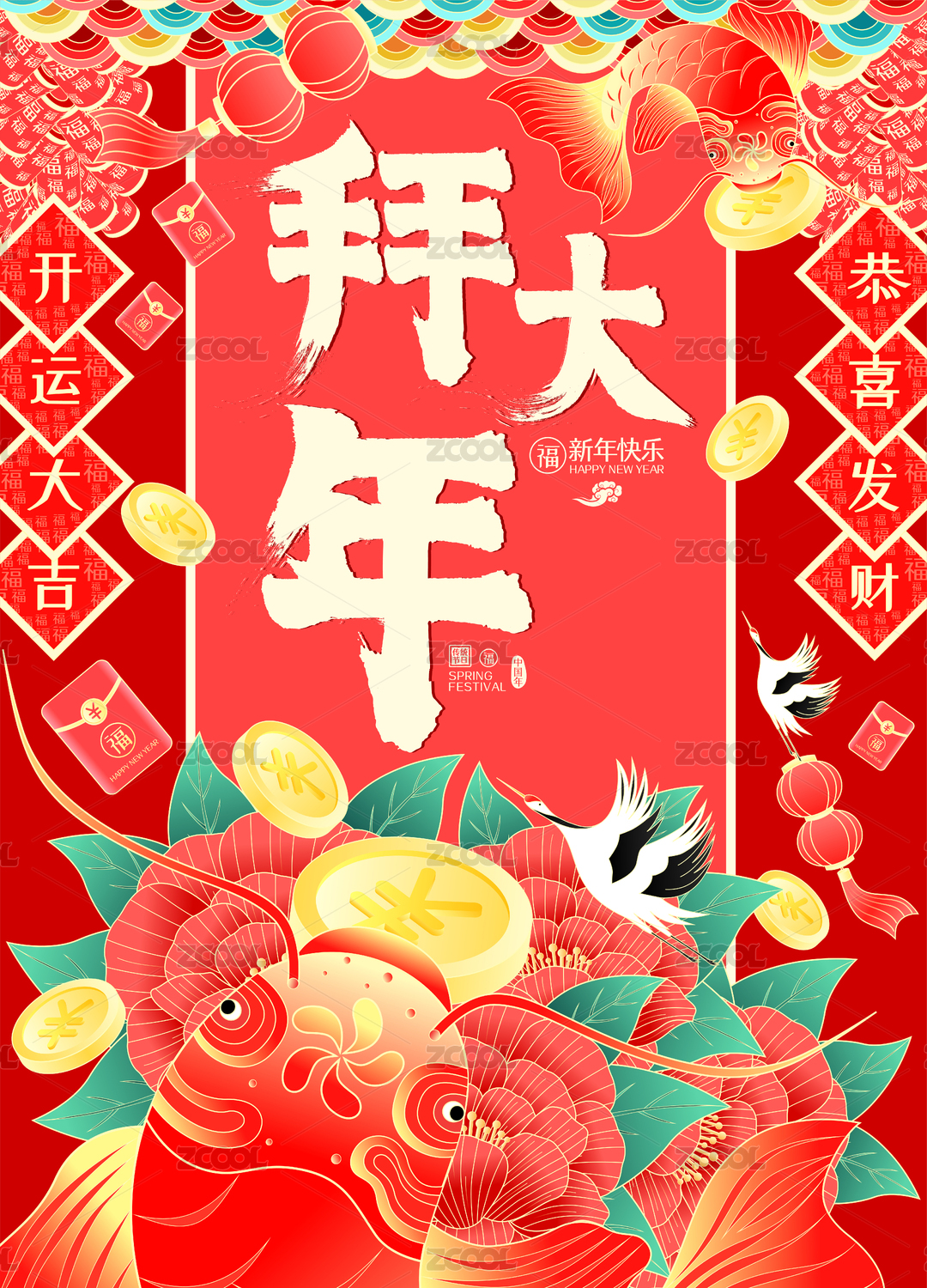 拜大年锦鲤开运牡丹花开春节矢量插画海报
