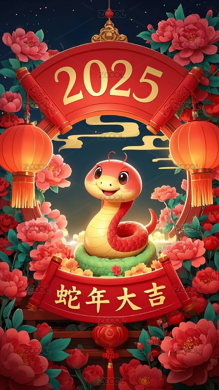 2025年蛇年大吉红色背景海报