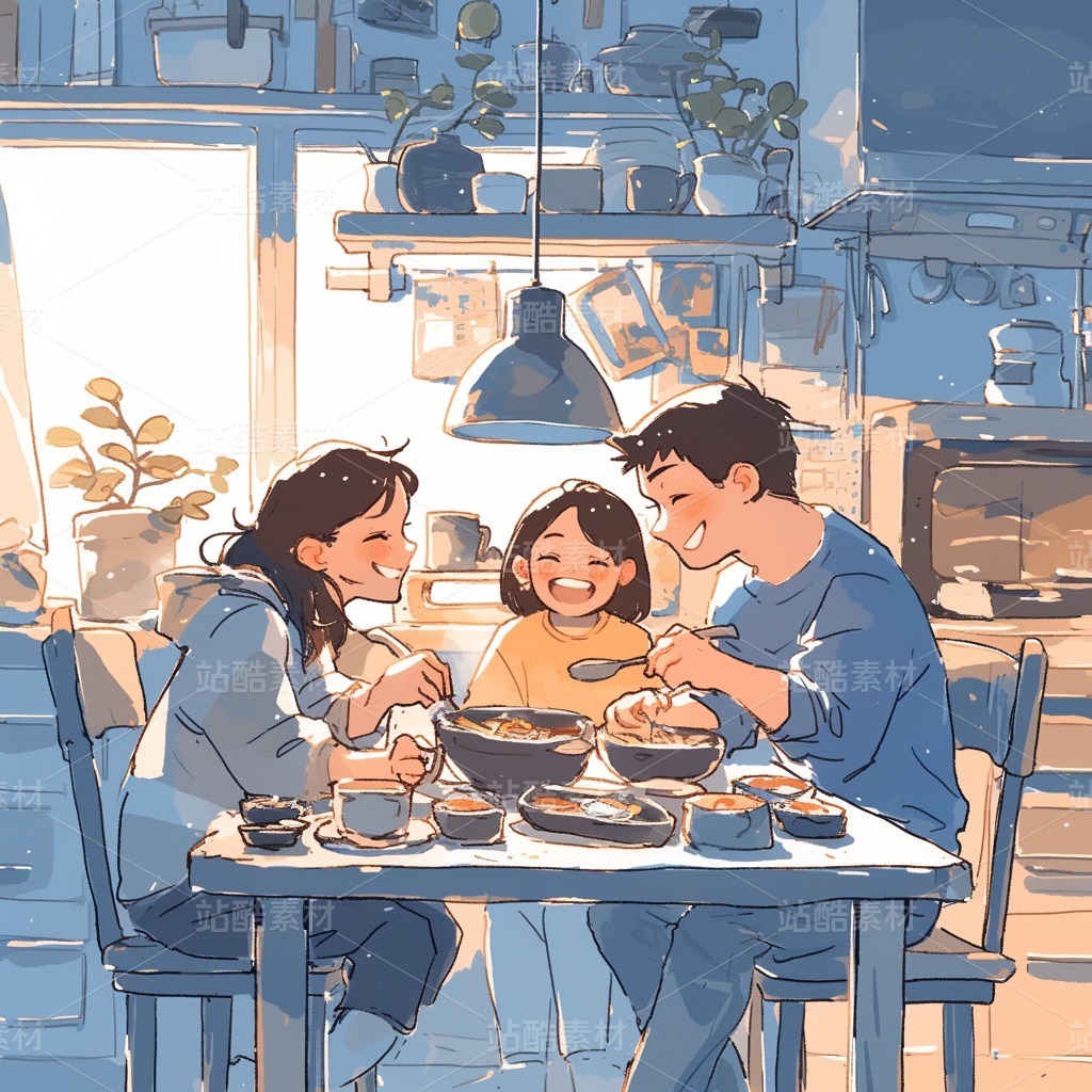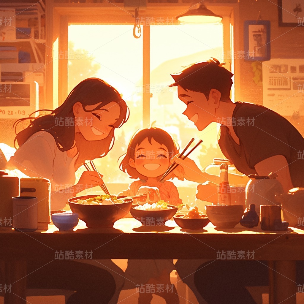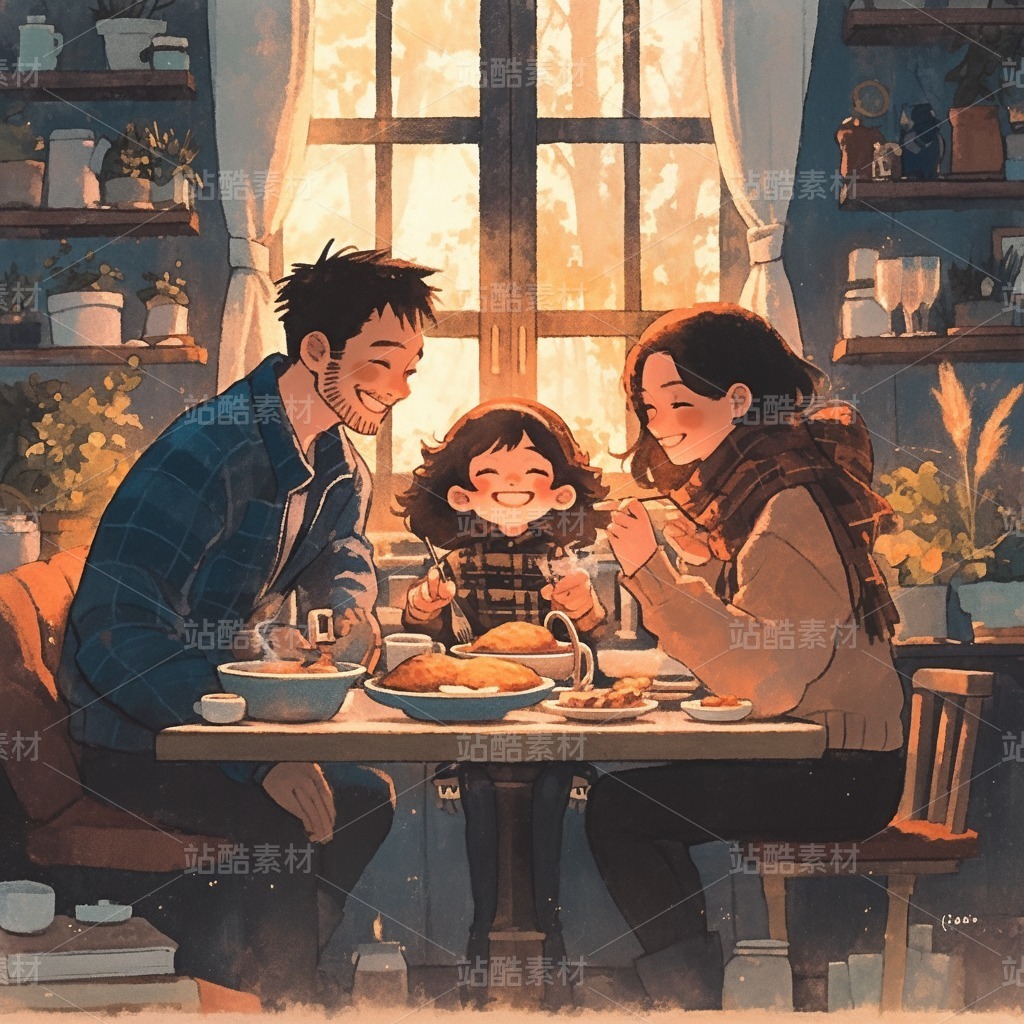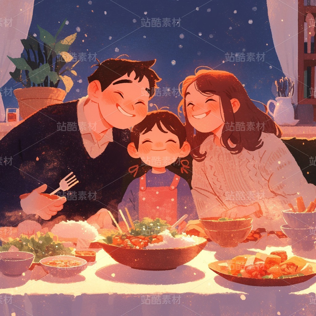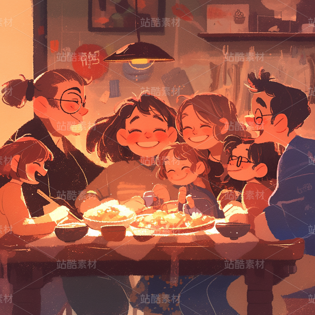 戴眼镜老爷爷和小朋友在餐桌旁共进晚餐
