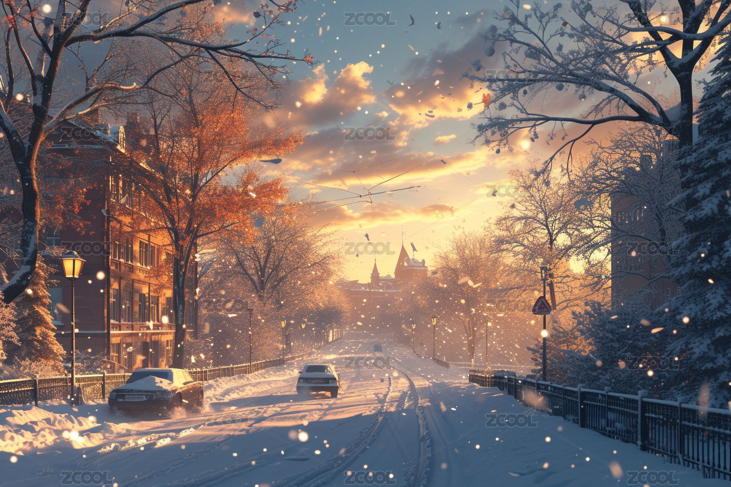 黄昏下雪有车的街道