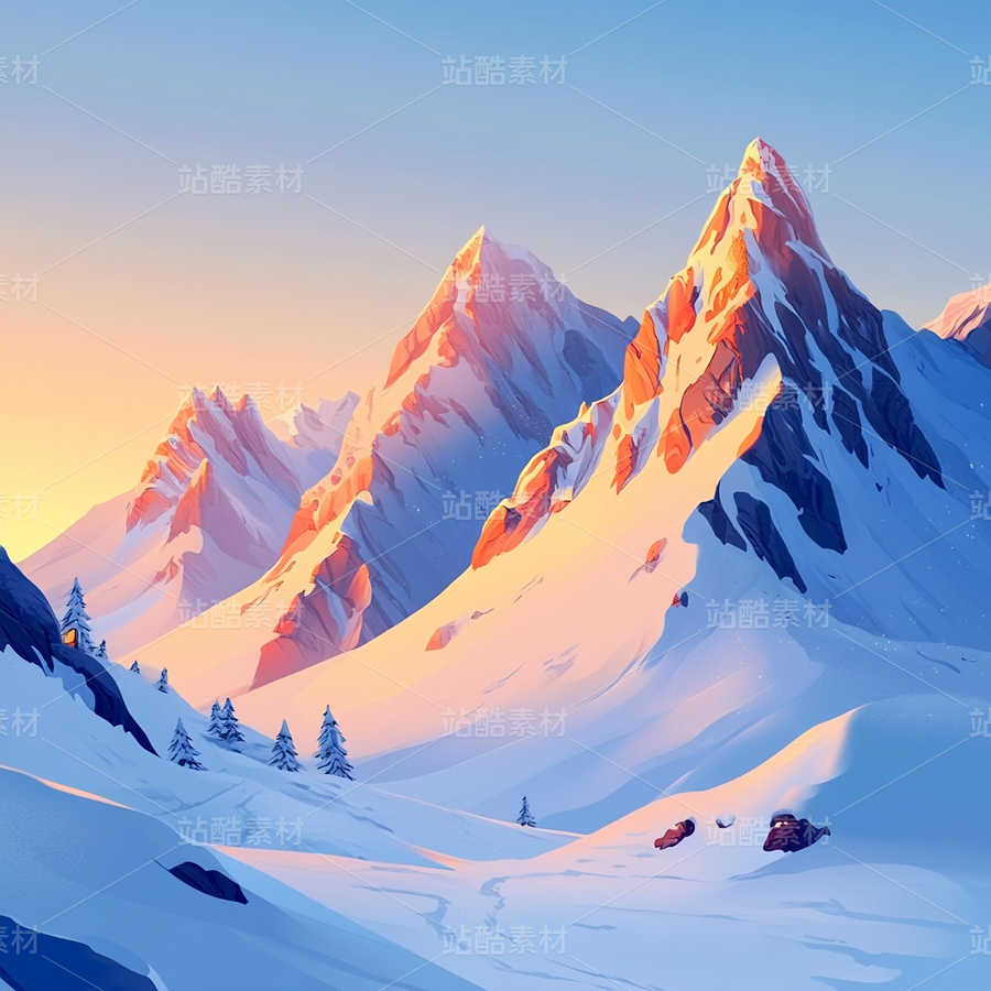 白天晴朗白雪覆盖的巍峨山峰雪山3D插画