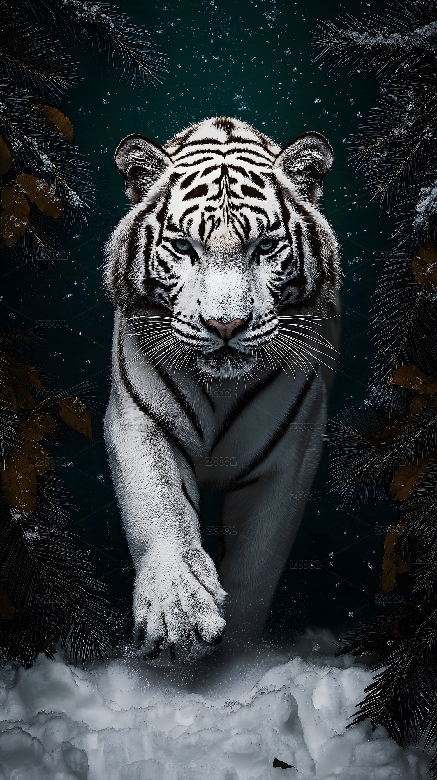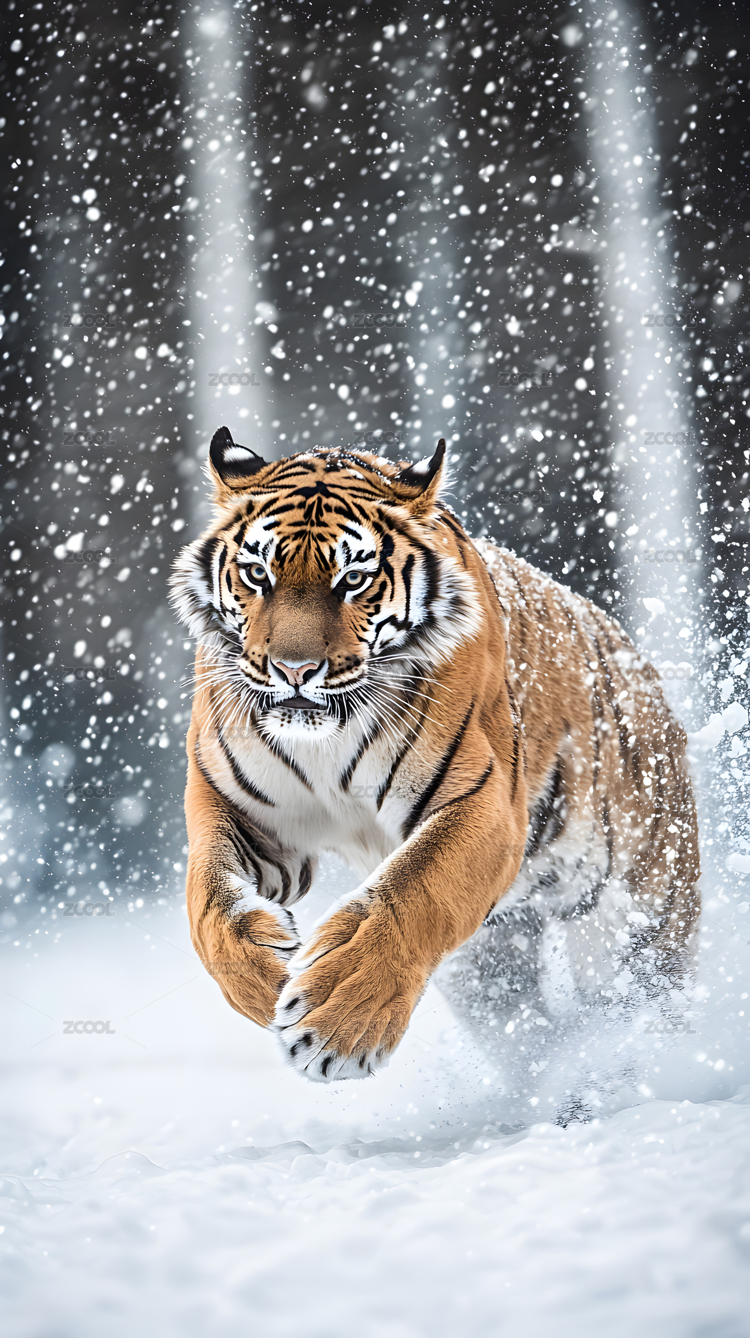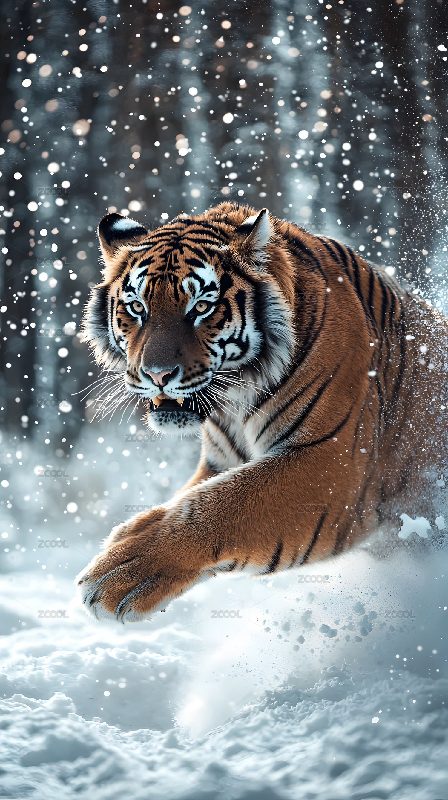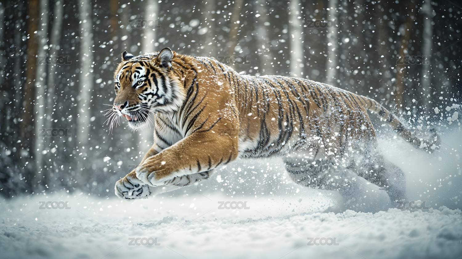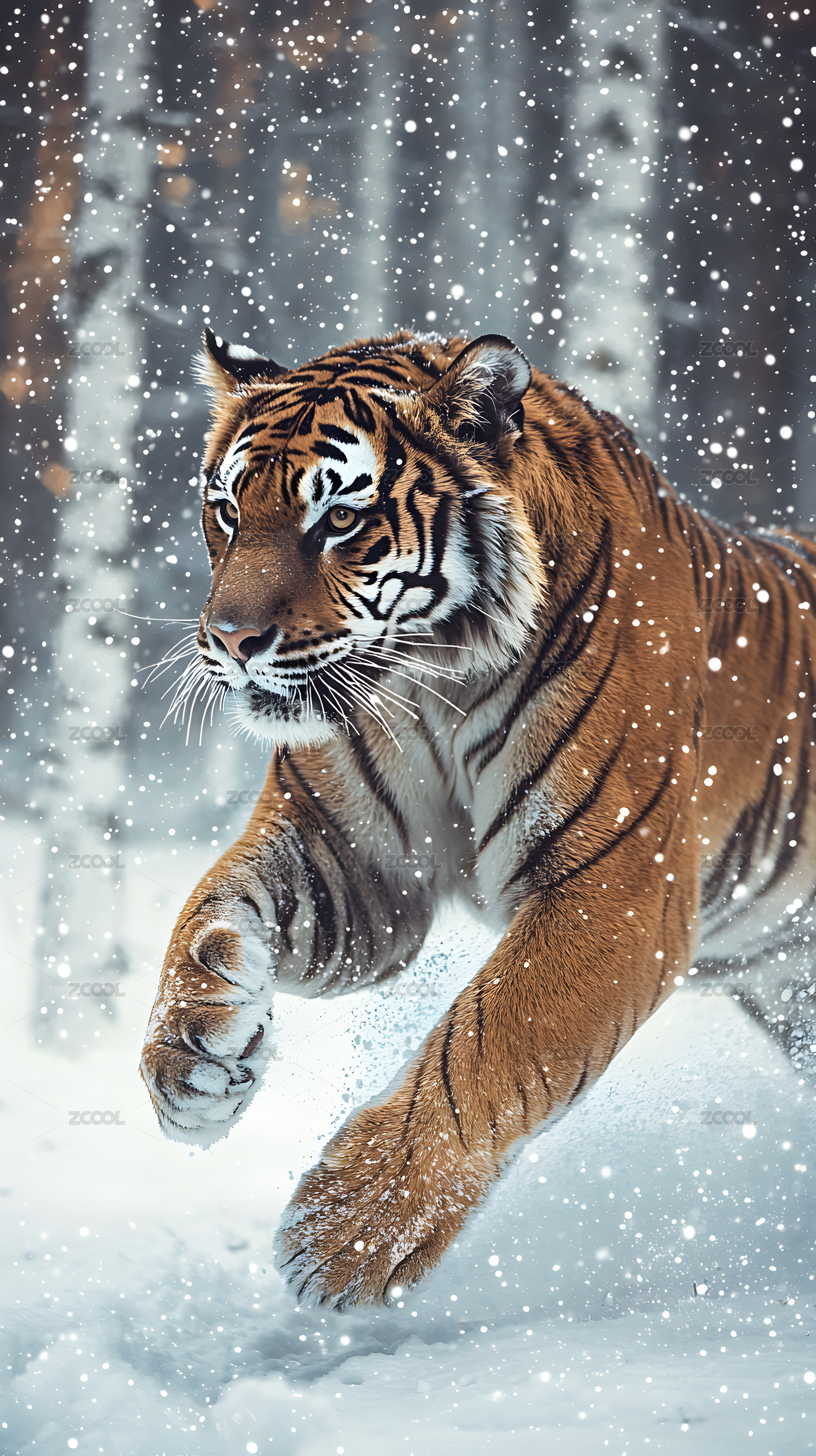 白虎雪地奔跑冬季森林梦幻场景