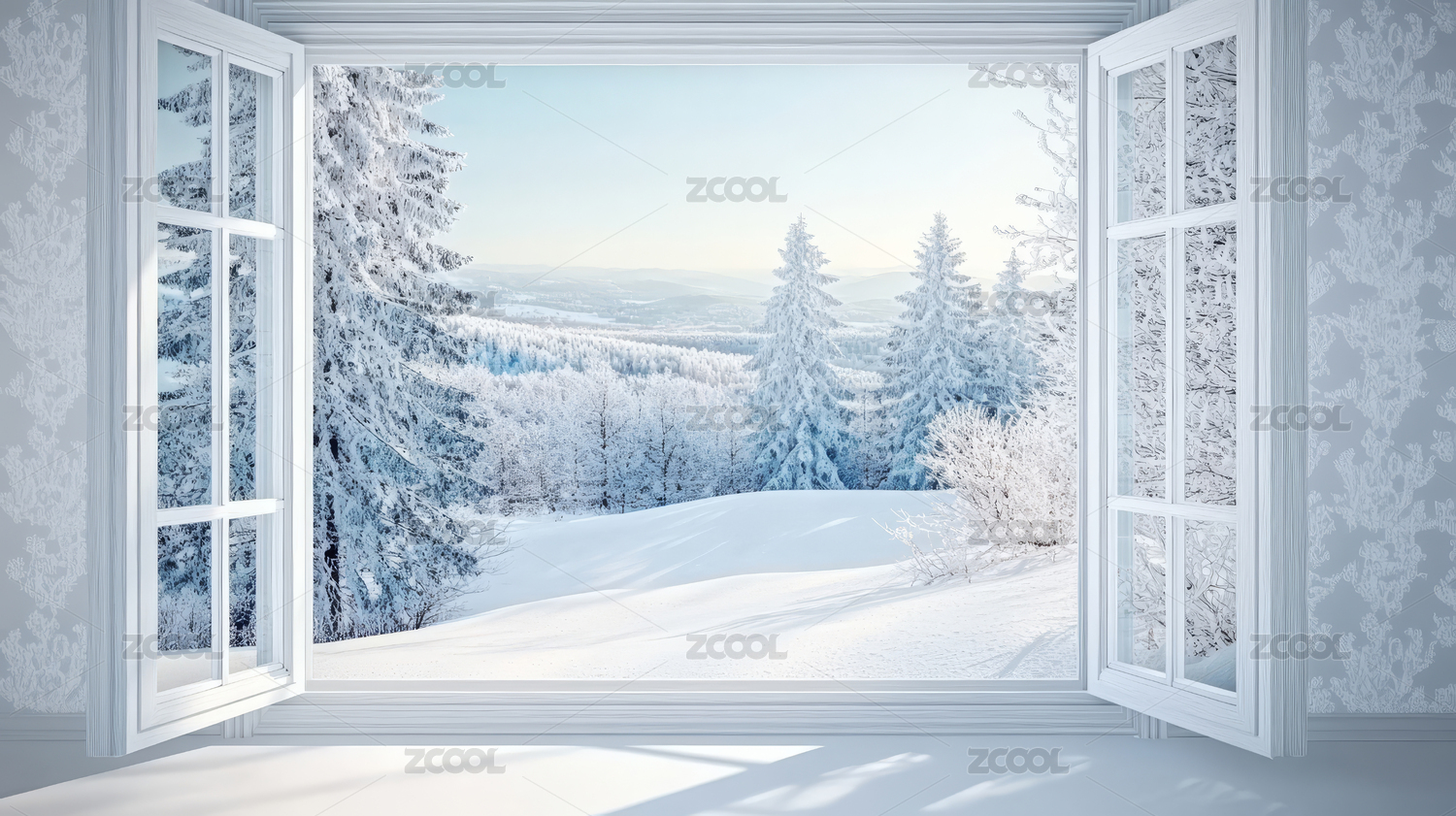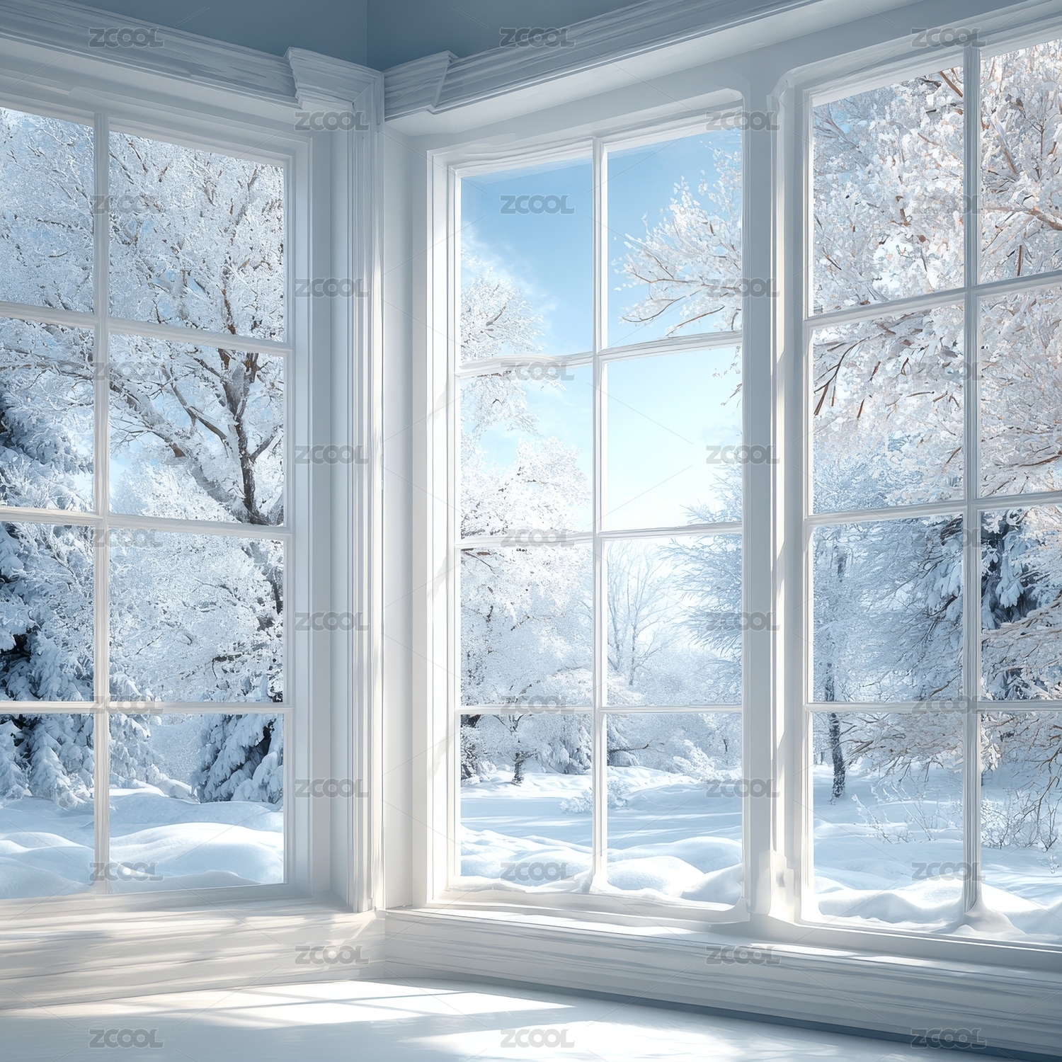 室内明亮窗户外的雪景