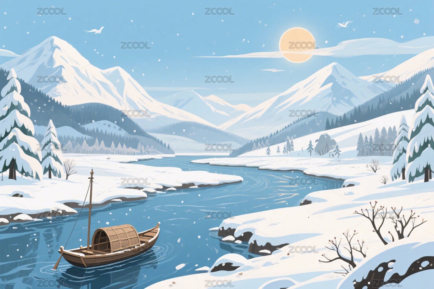 冬季雪山河流帆船