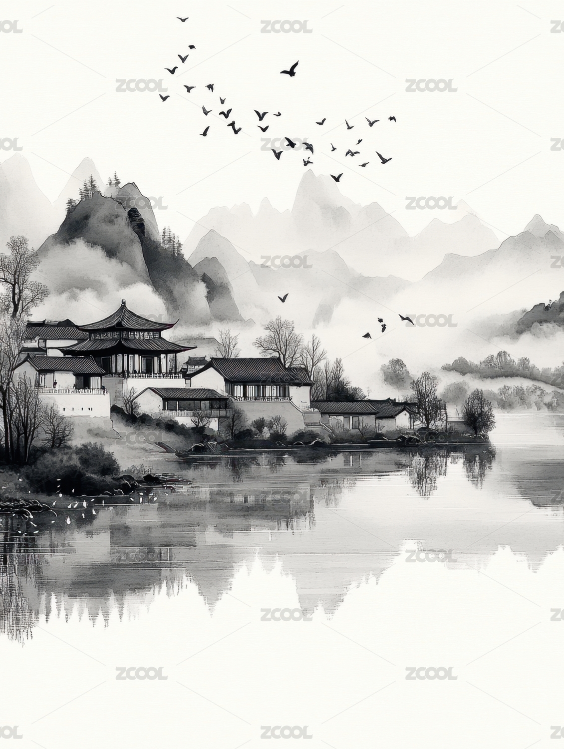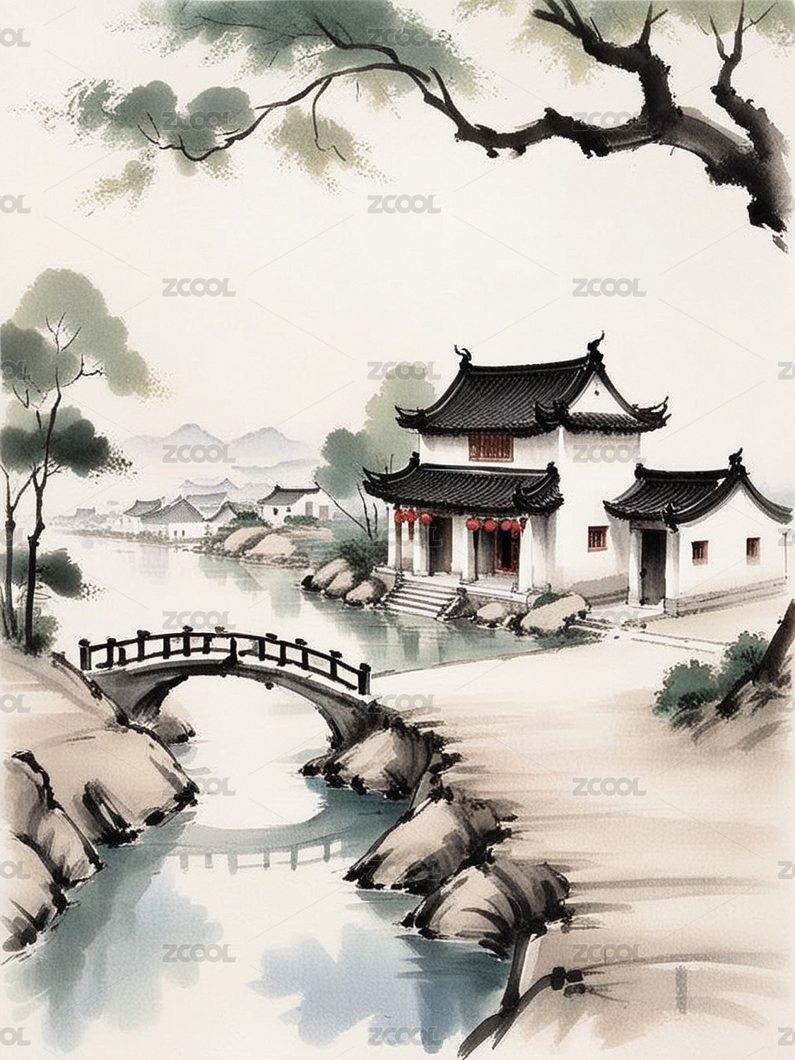 中国水墨画风格江南山水秋天春天拱桥亭子