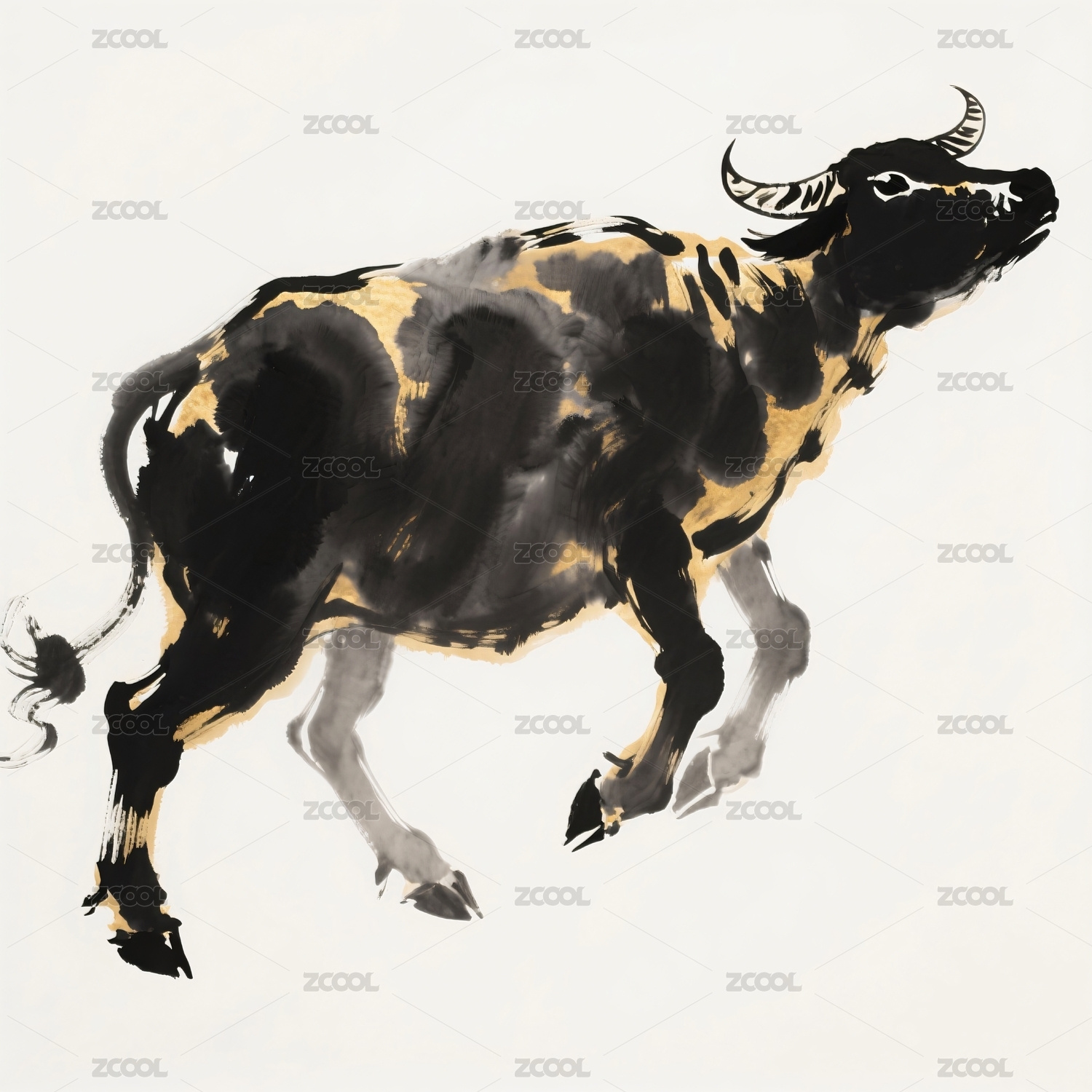 水墨奔跑水牛图