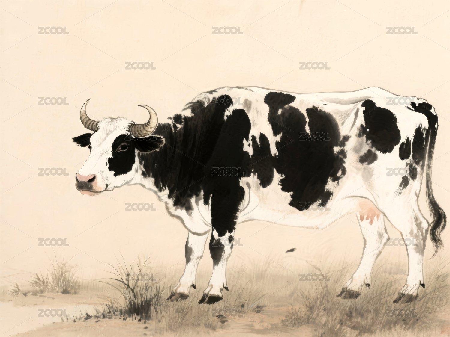 水墨风格雄壮公牛侧身站立
