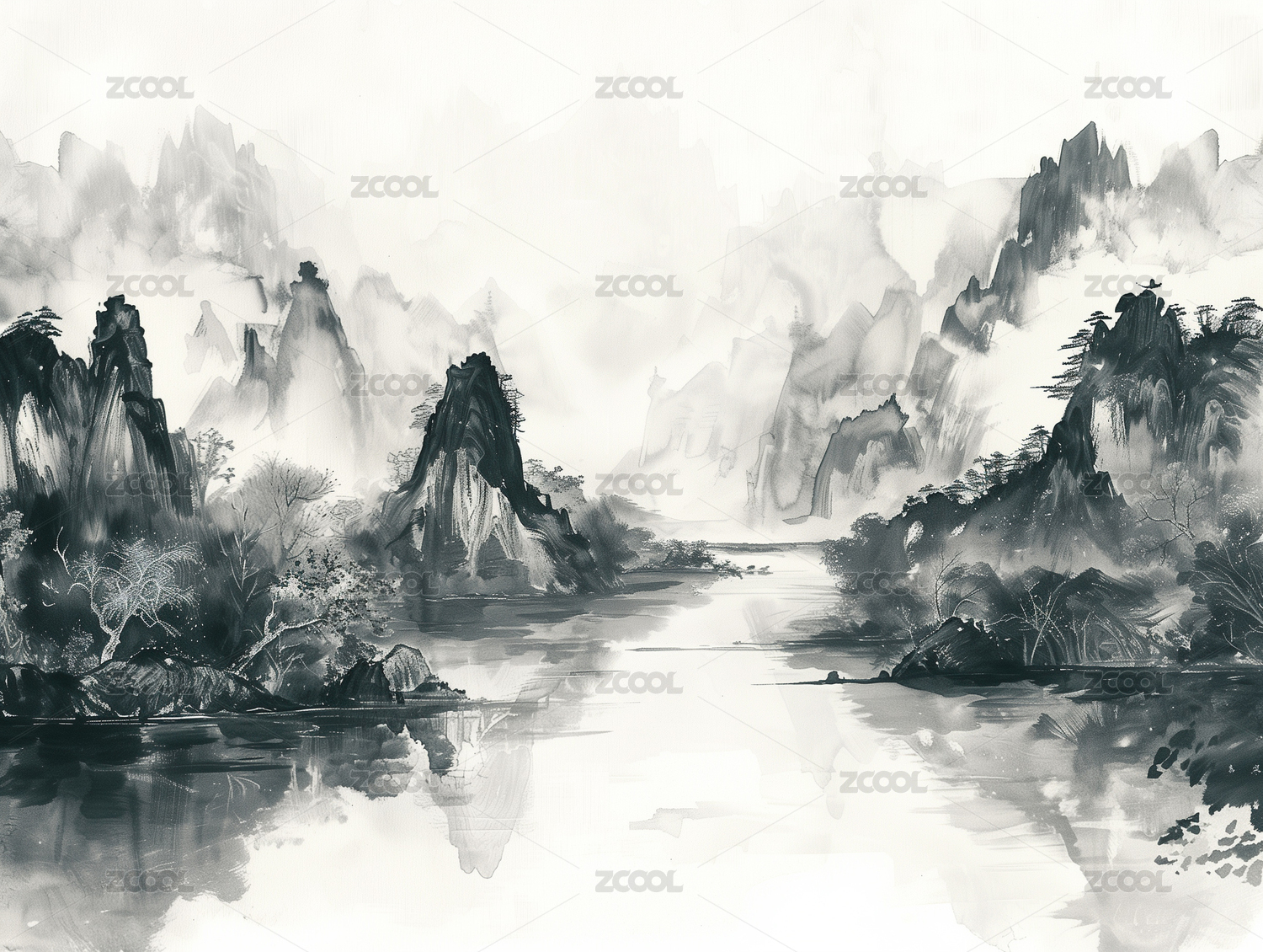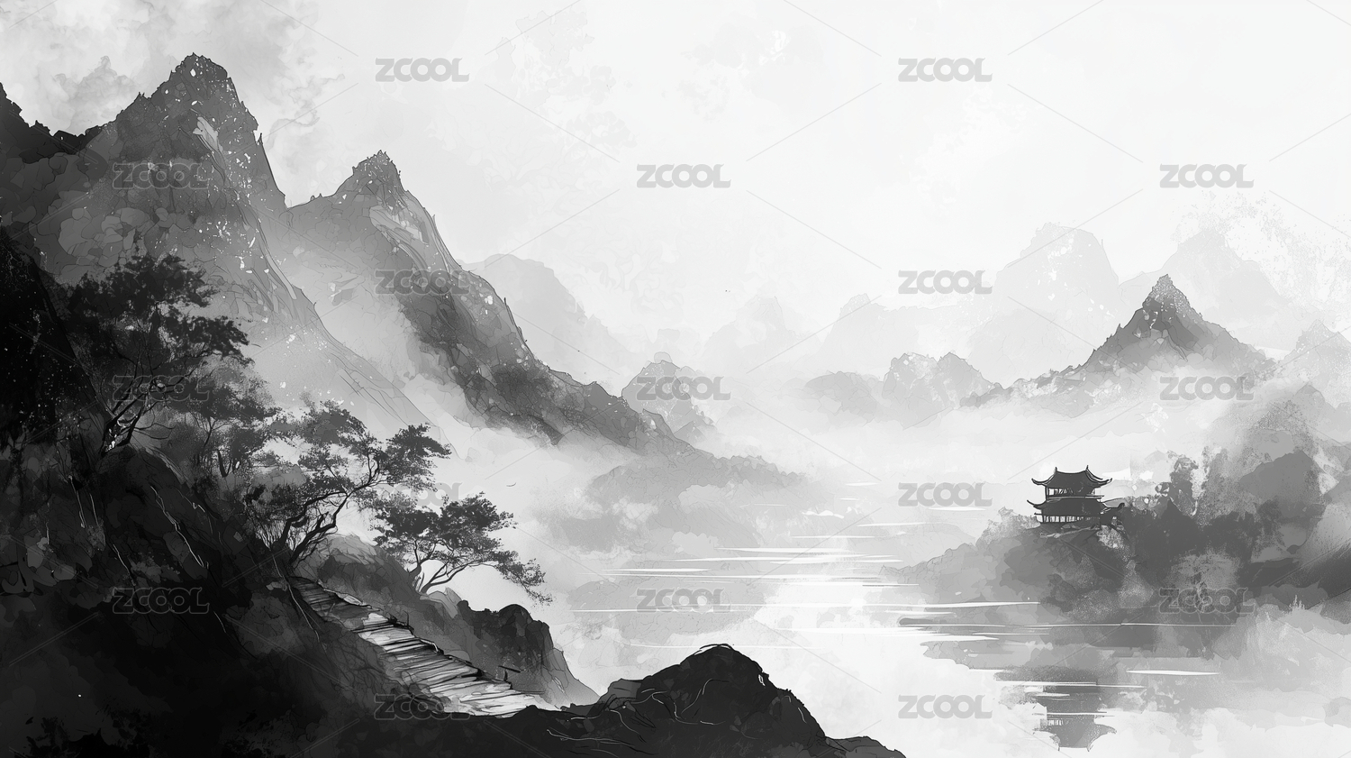 蓝色调的水墨风山水画,水墨风意境山水画概