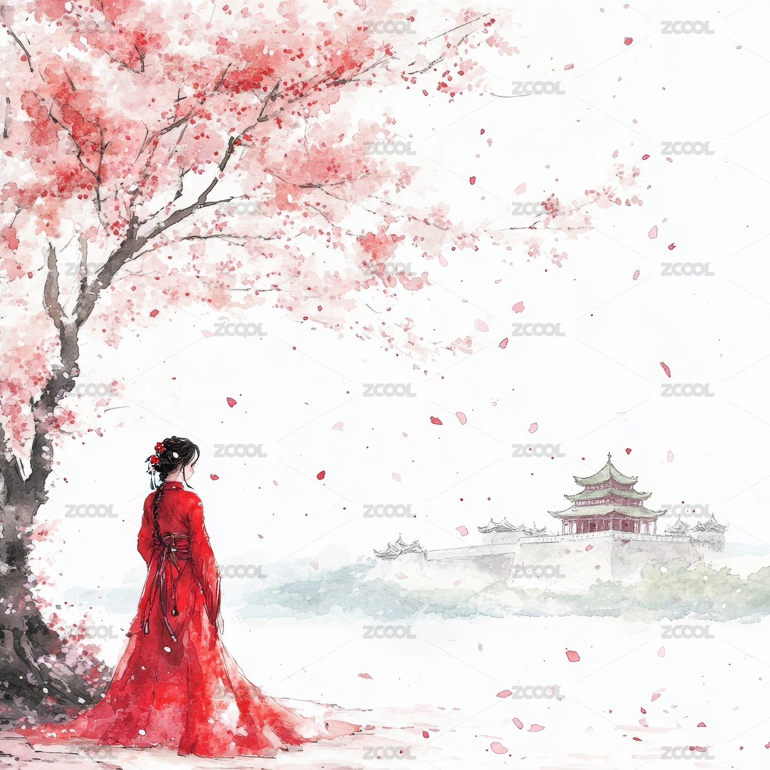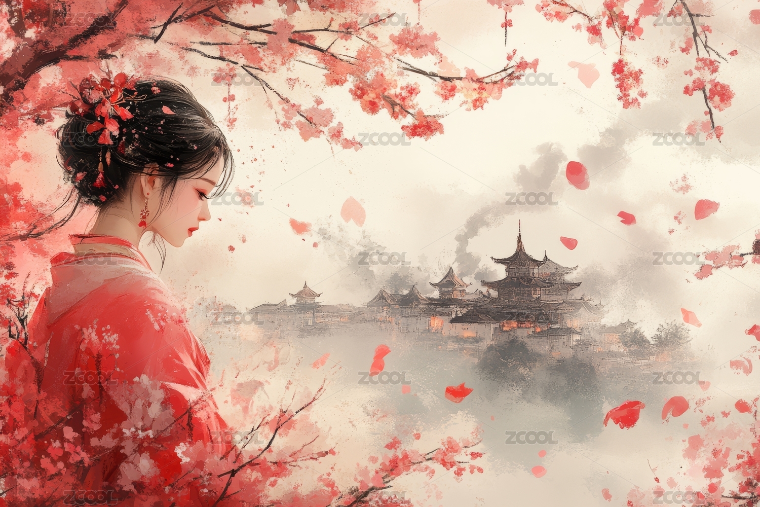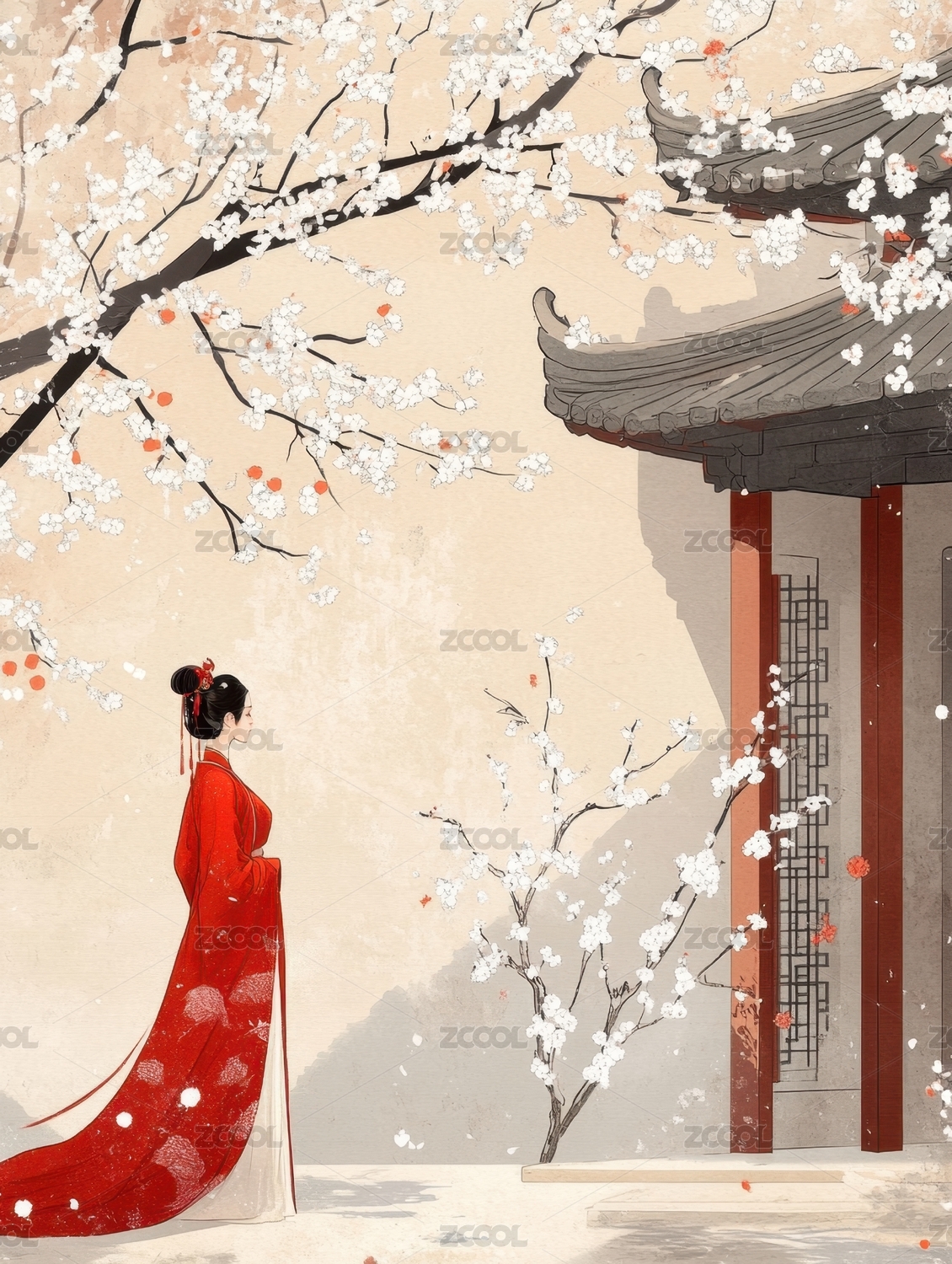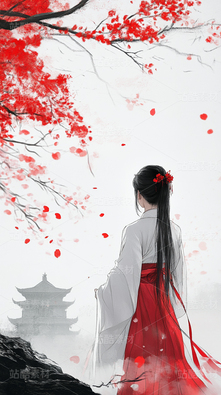 红衣女子与落花庭院