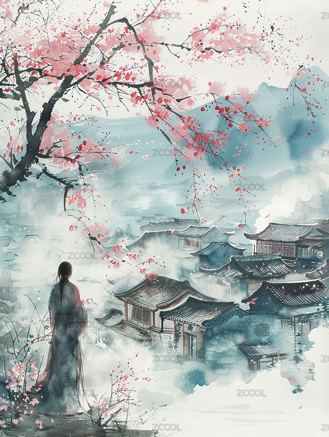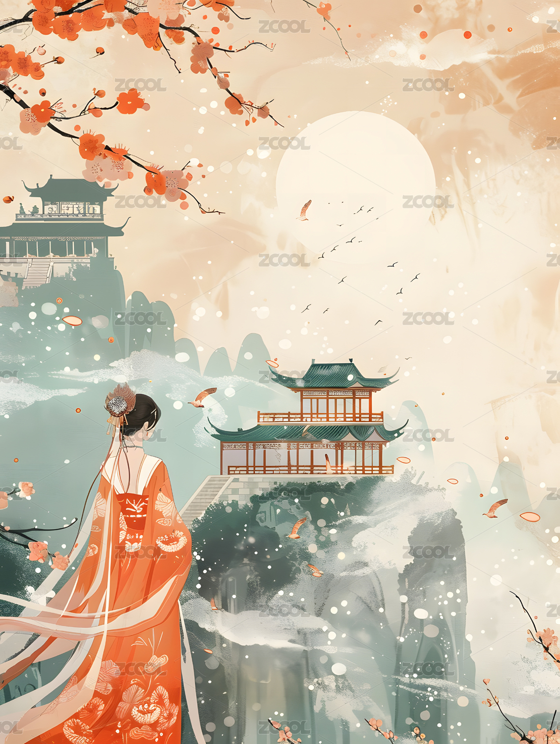 中国风美女山水海报插画
