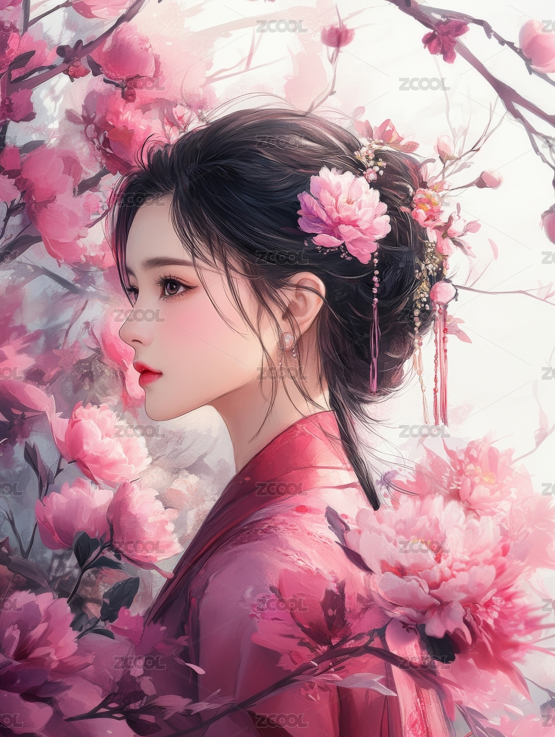 粉衣女子与桃花