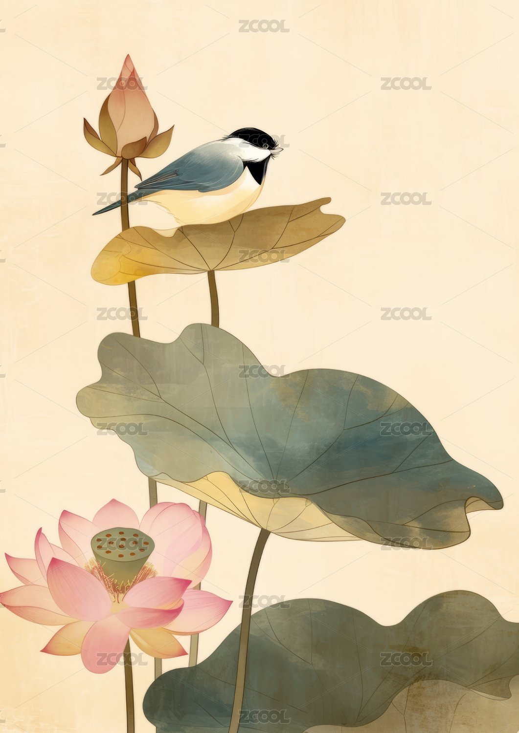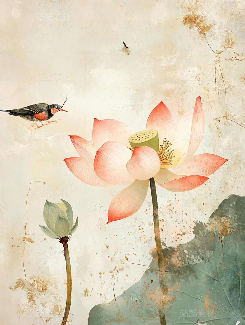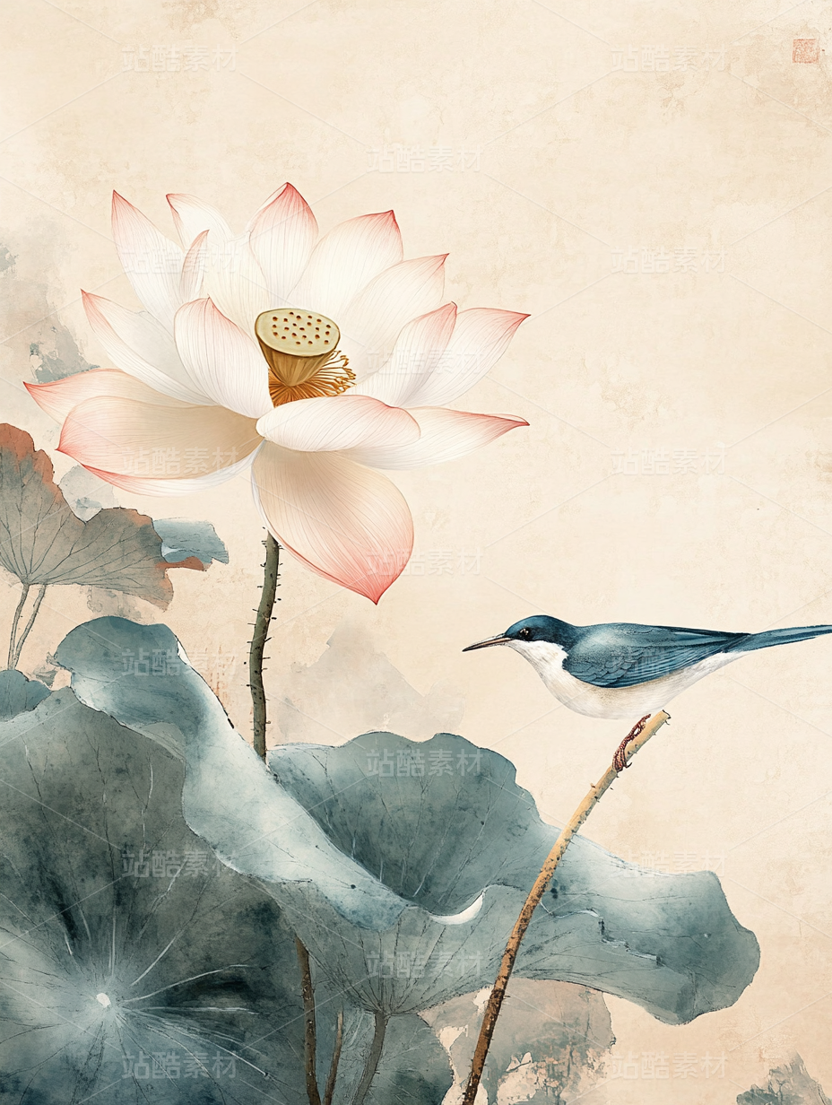荷花鸟工笔画插画