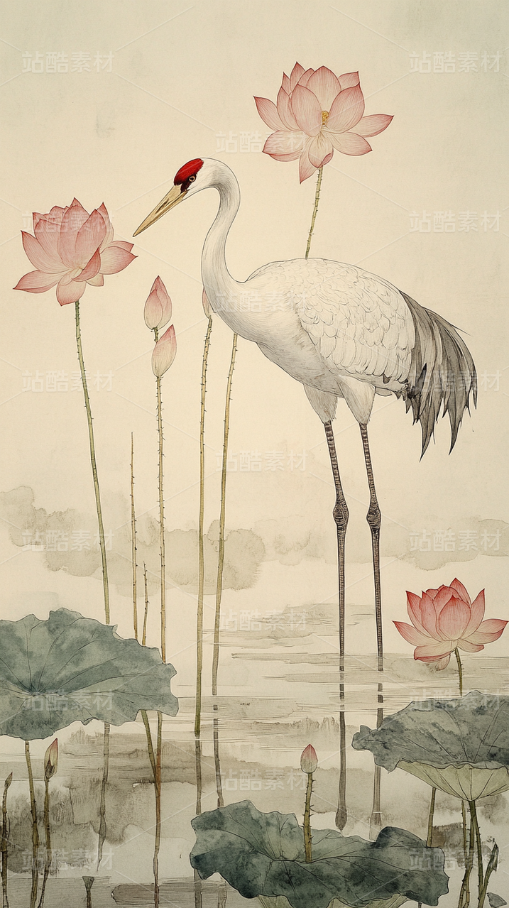 中国传统水墨画国画工笔画白鹤站在荷花池