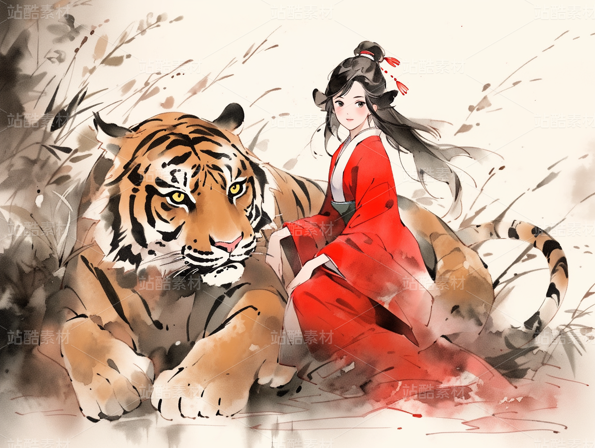 美女与老虎古风插画