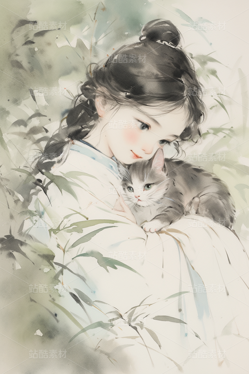 古风水墨画 人物和猫猫