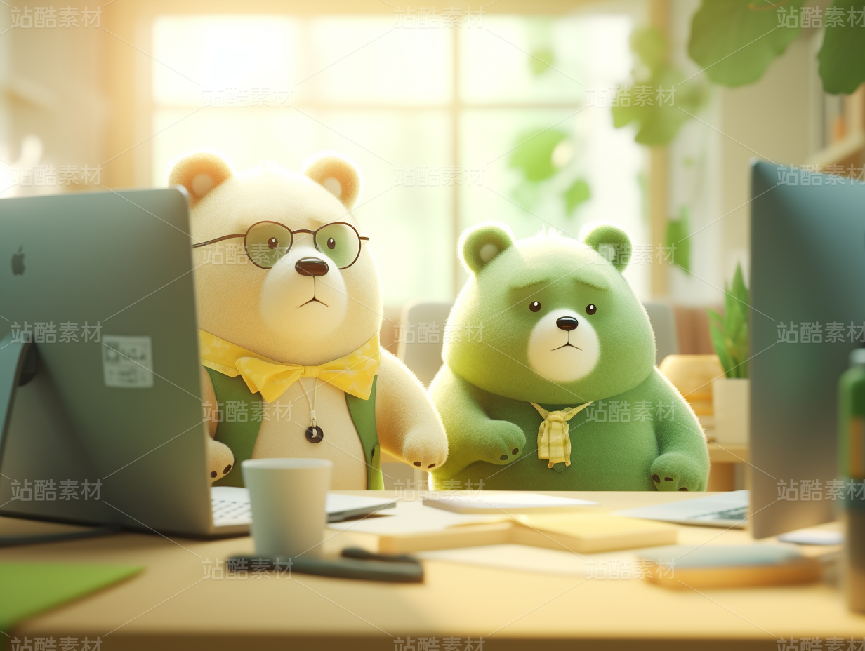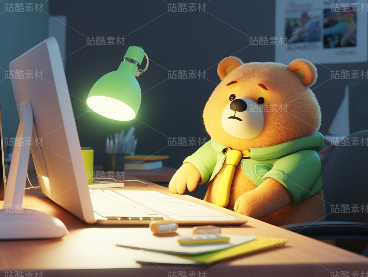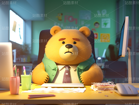 3D卡通毛绒绒可爱熊熊办公室加班
