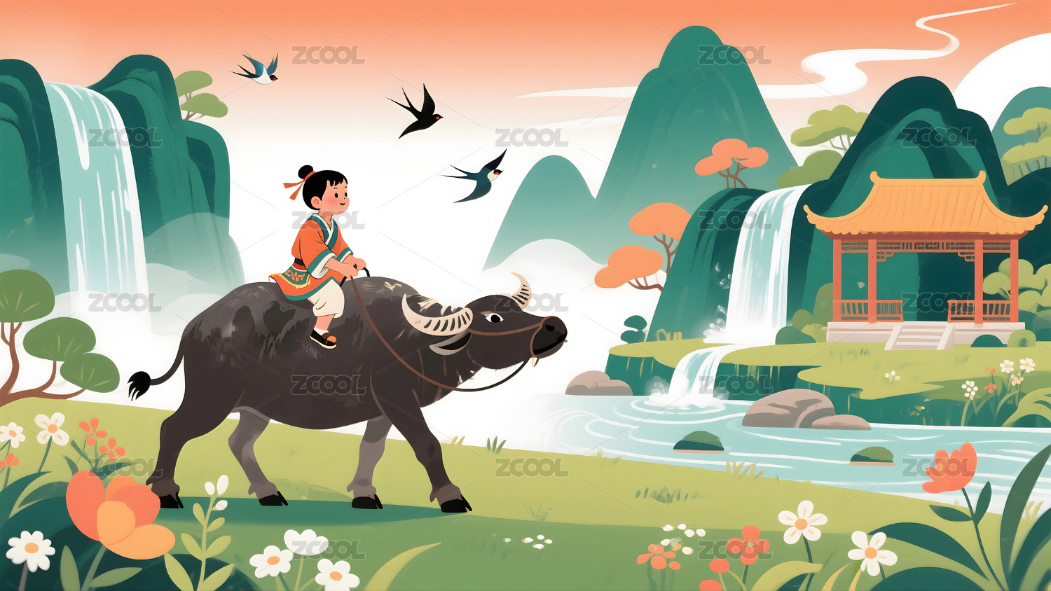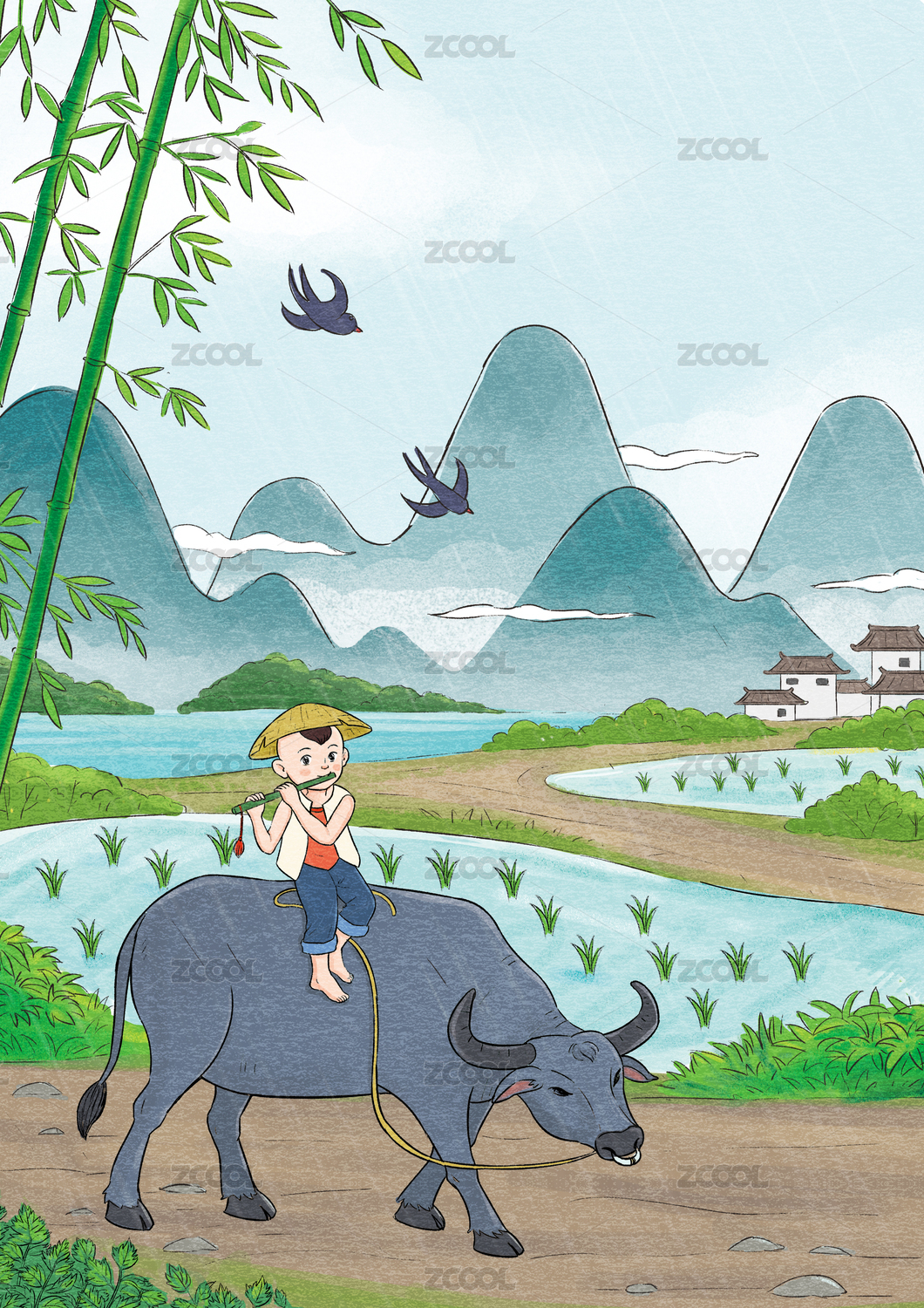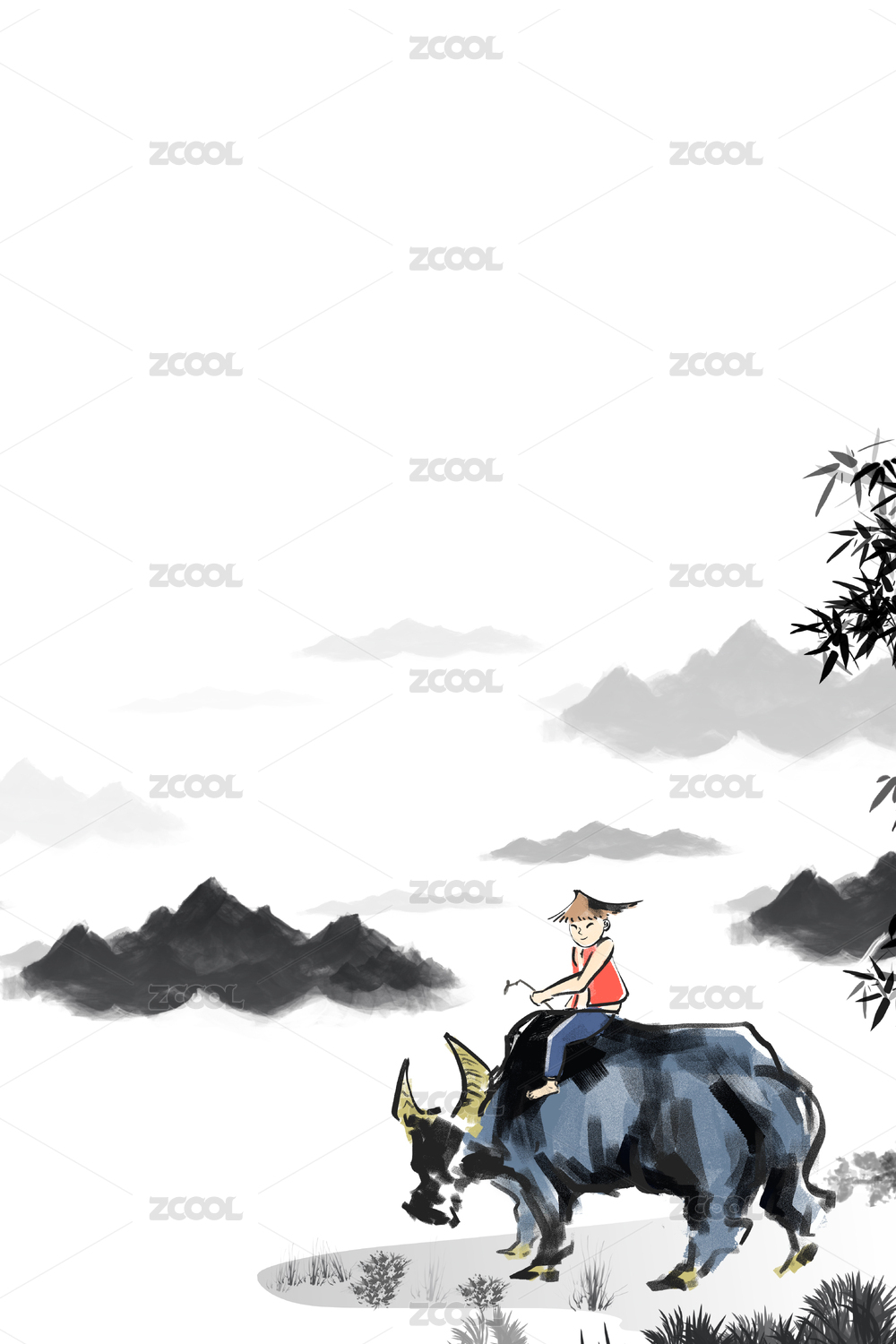 国画水墨人物水墨画放牛娃画江南风景乡村墙绘素材