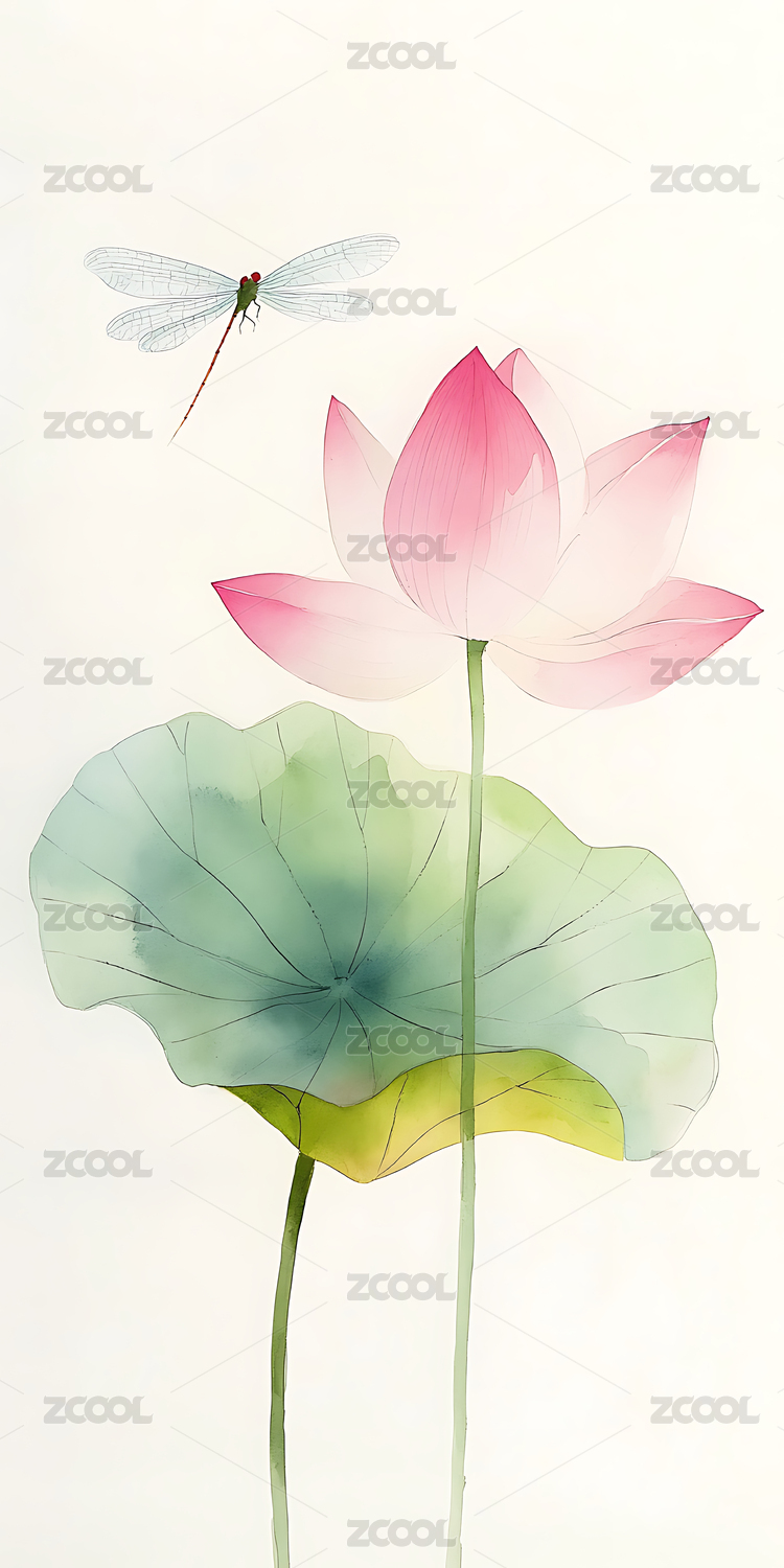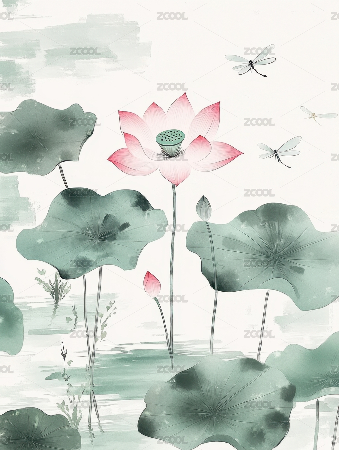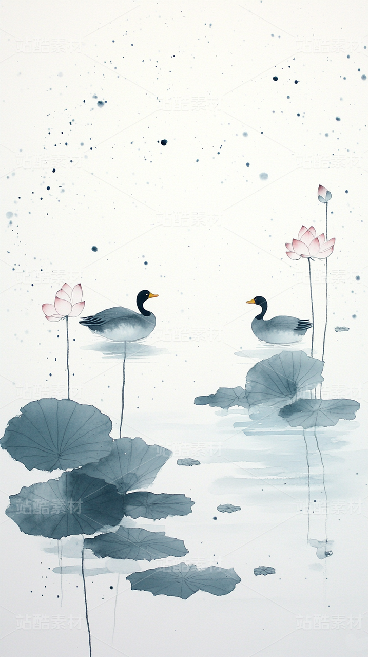 中国传统水墨画国画极简鸳鸯在莲花盛开的池塘中