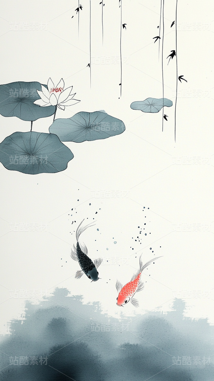 中国传统水墨画国画极简锦鲤在池塘游动