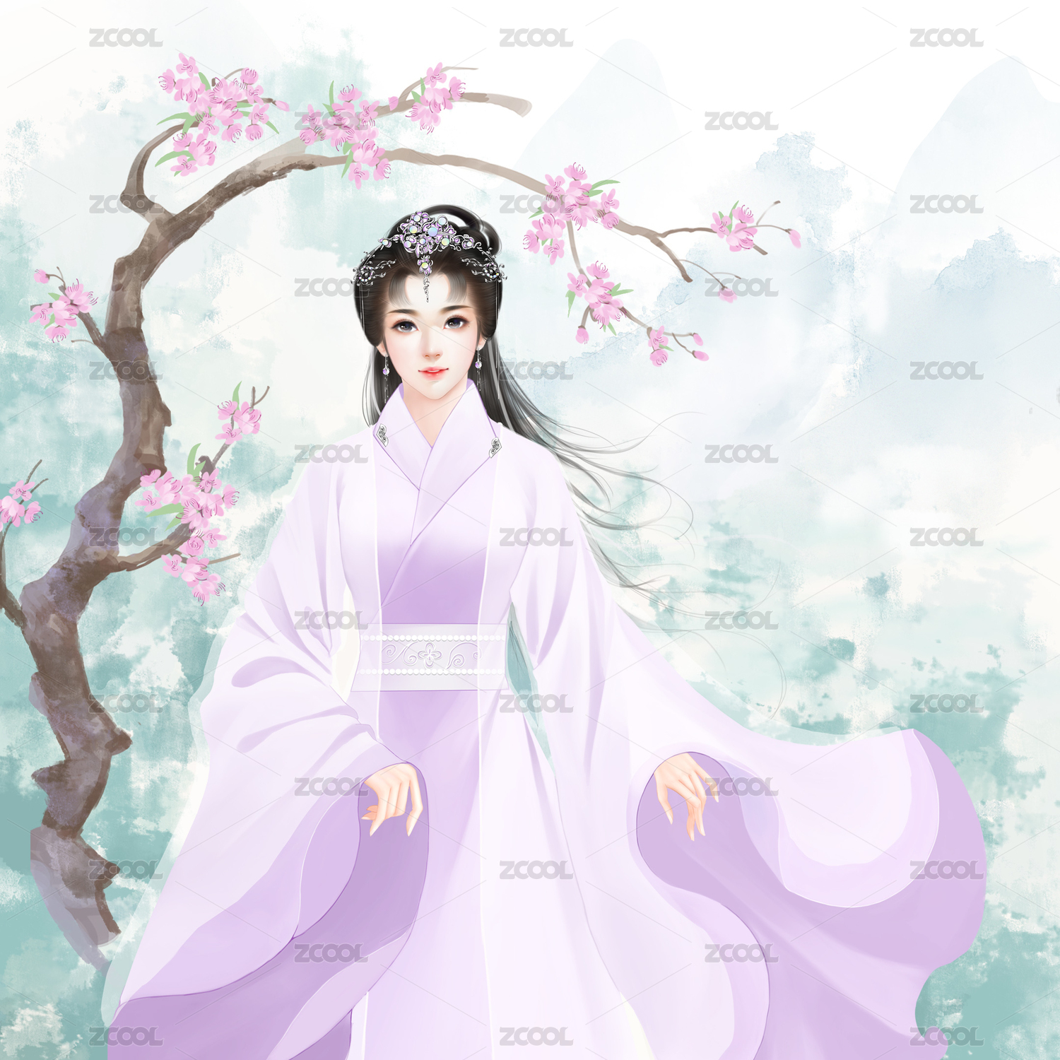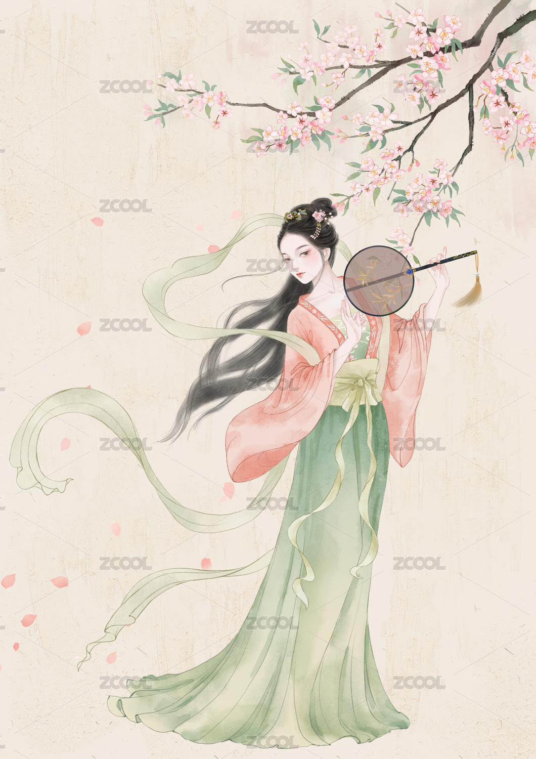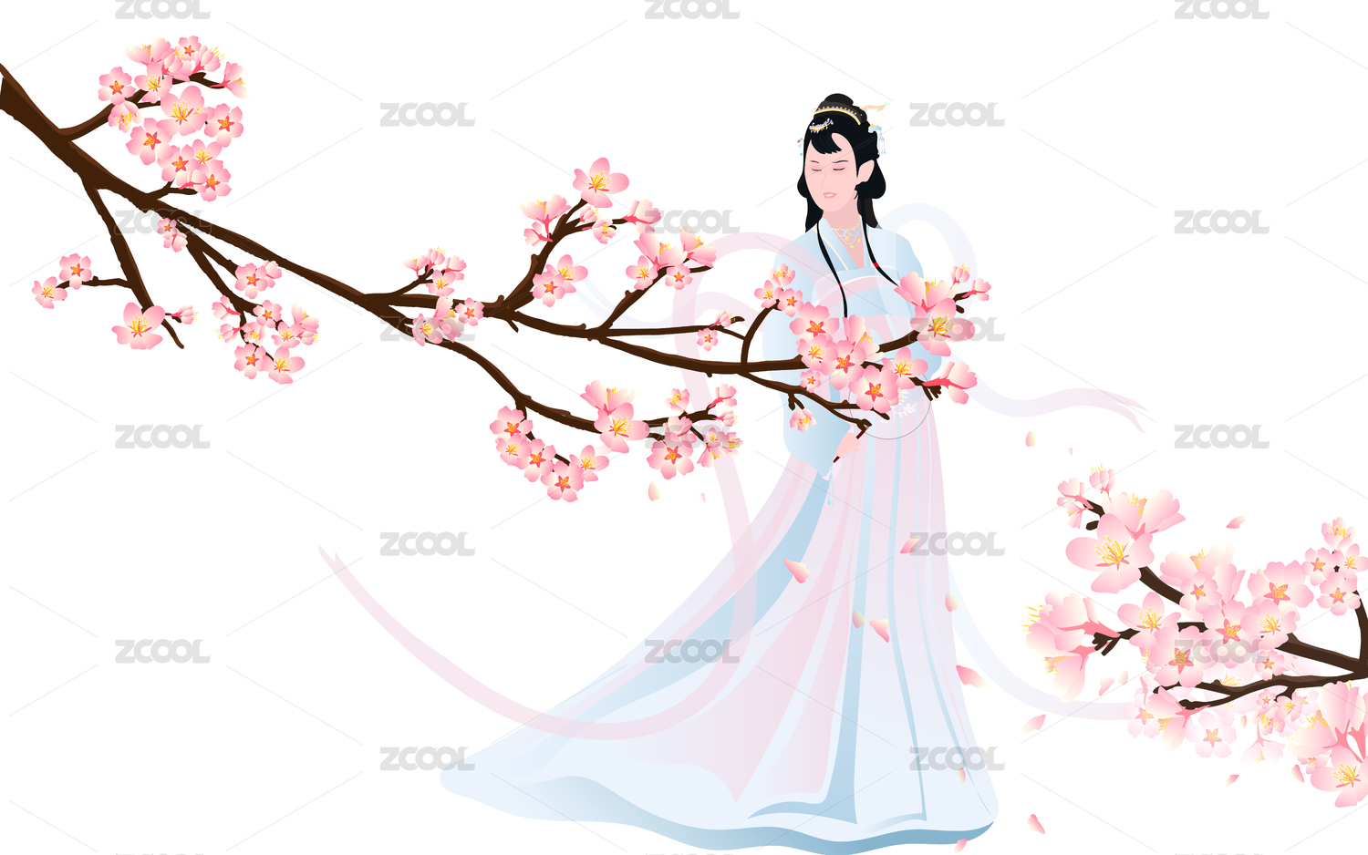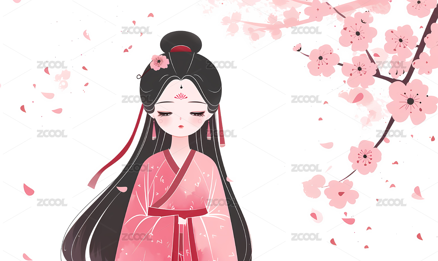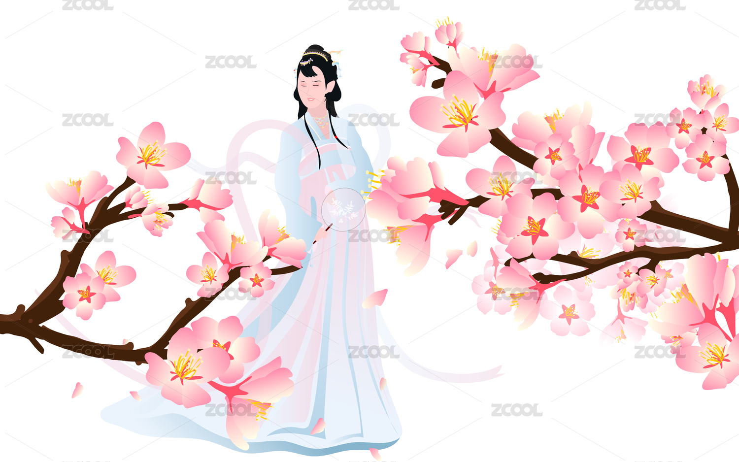 春天郊外的桃花树下站着一位粉衣小姑娘