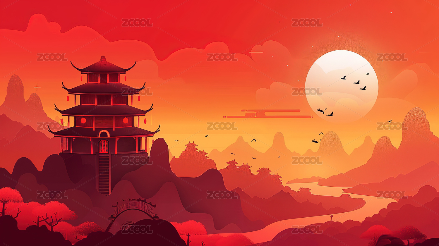 新中式国风亭台楼阁建筑工装背景墙壁画