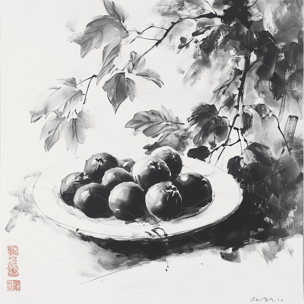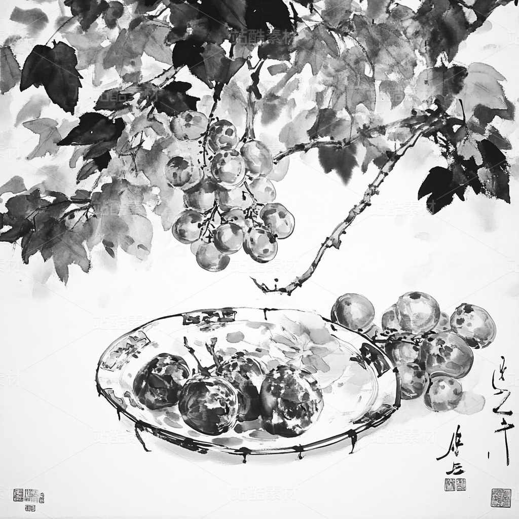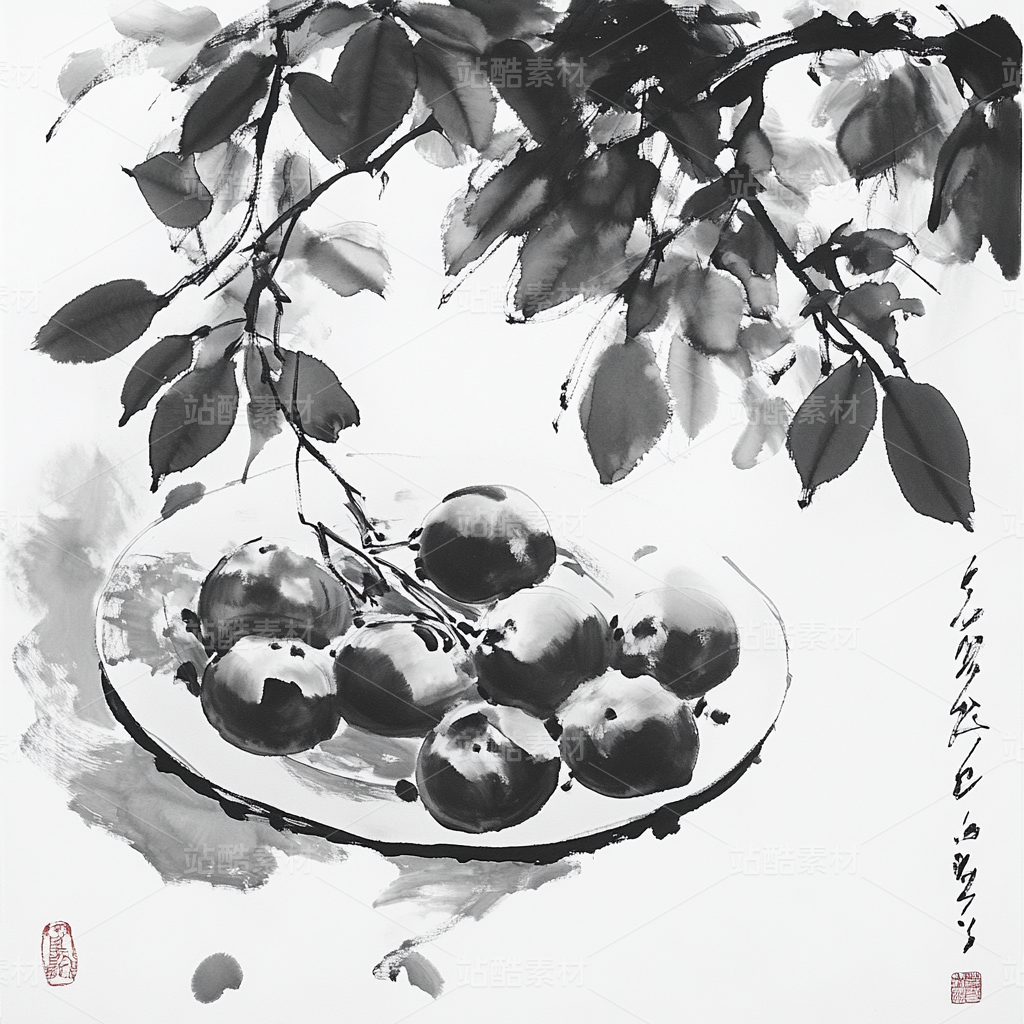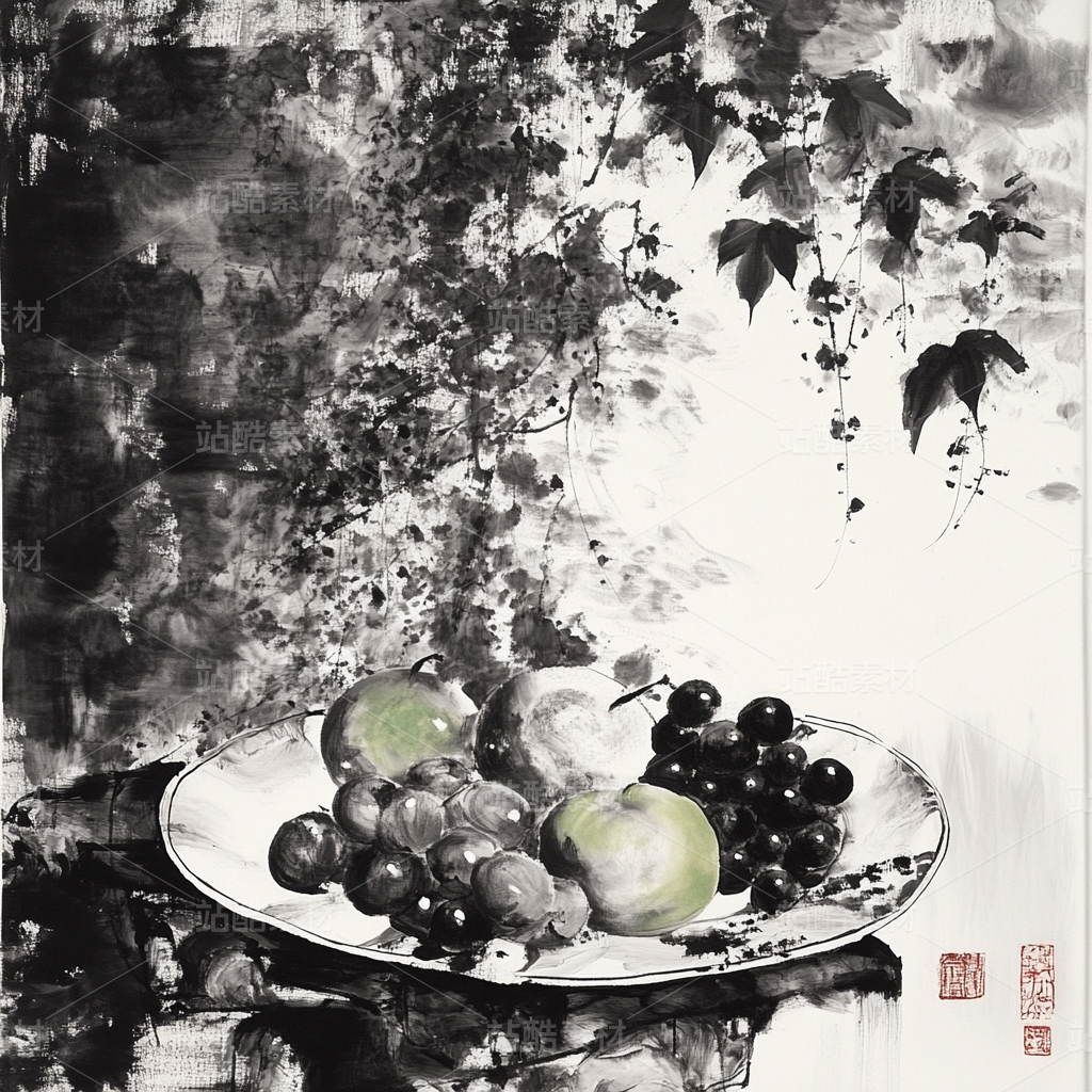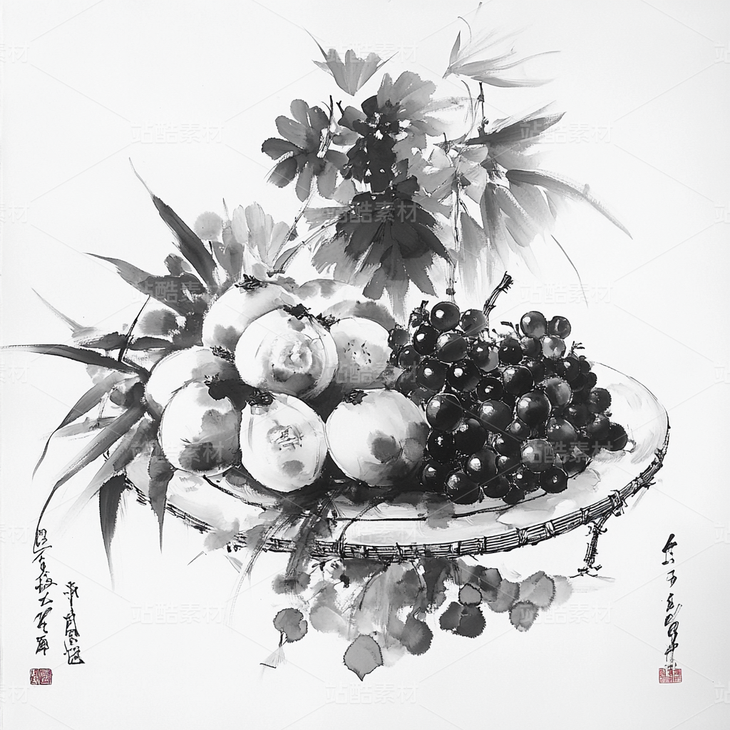 s1ckxgod0422_Chinese_Ink_Painting_Fruit_Plate_Black_White_and_R_4e3c886b-7f0f-43f3-8d2b-331b6af018f