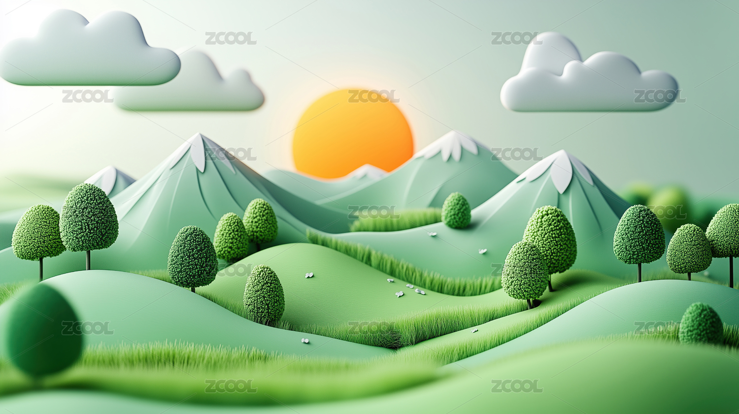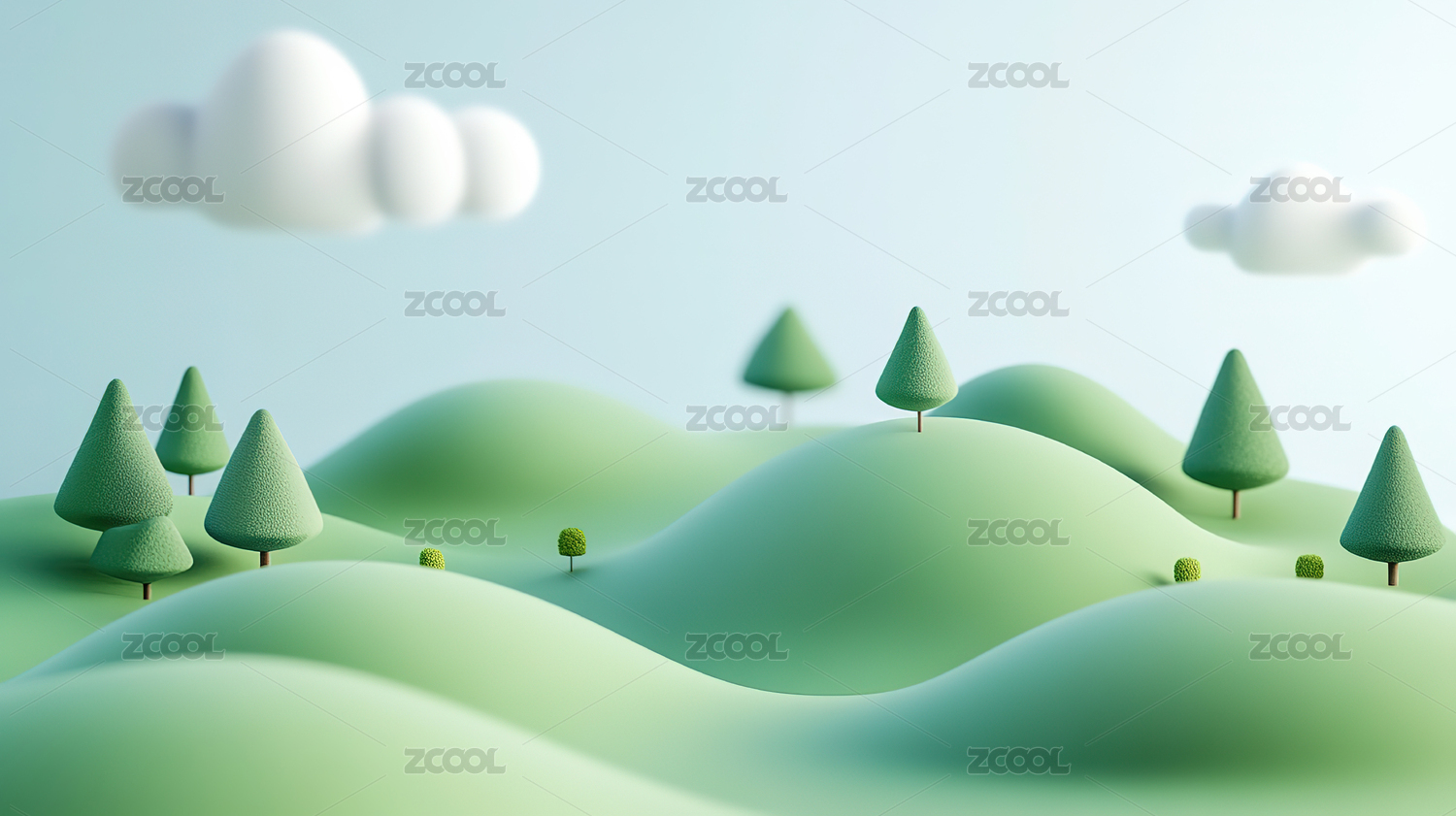 5绿色山坡草地远处是蓝天白云的3D卡通场景