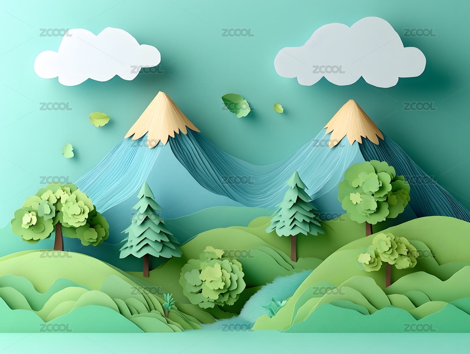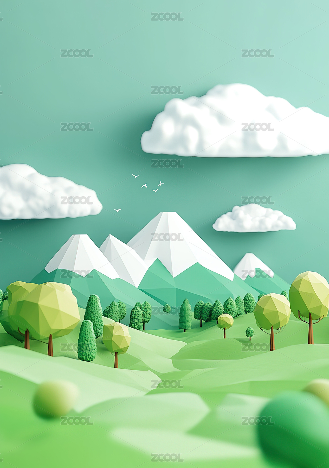 1绿色山坡草地远处是蓝天白云的3D卡通场