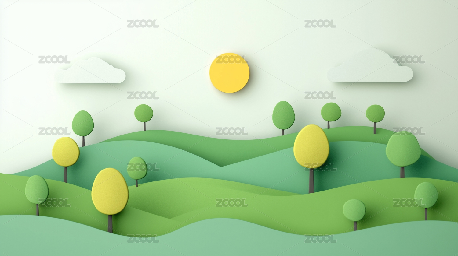 绿色山坡草地远处是蓝天白云的3D儿童卡通场景