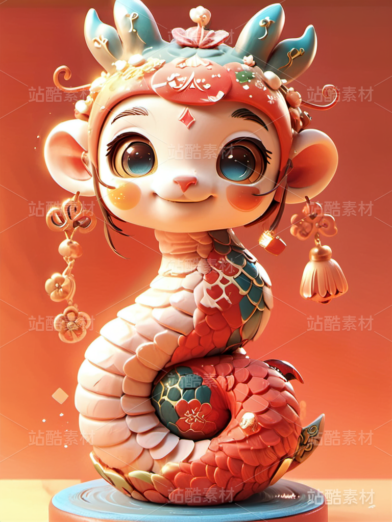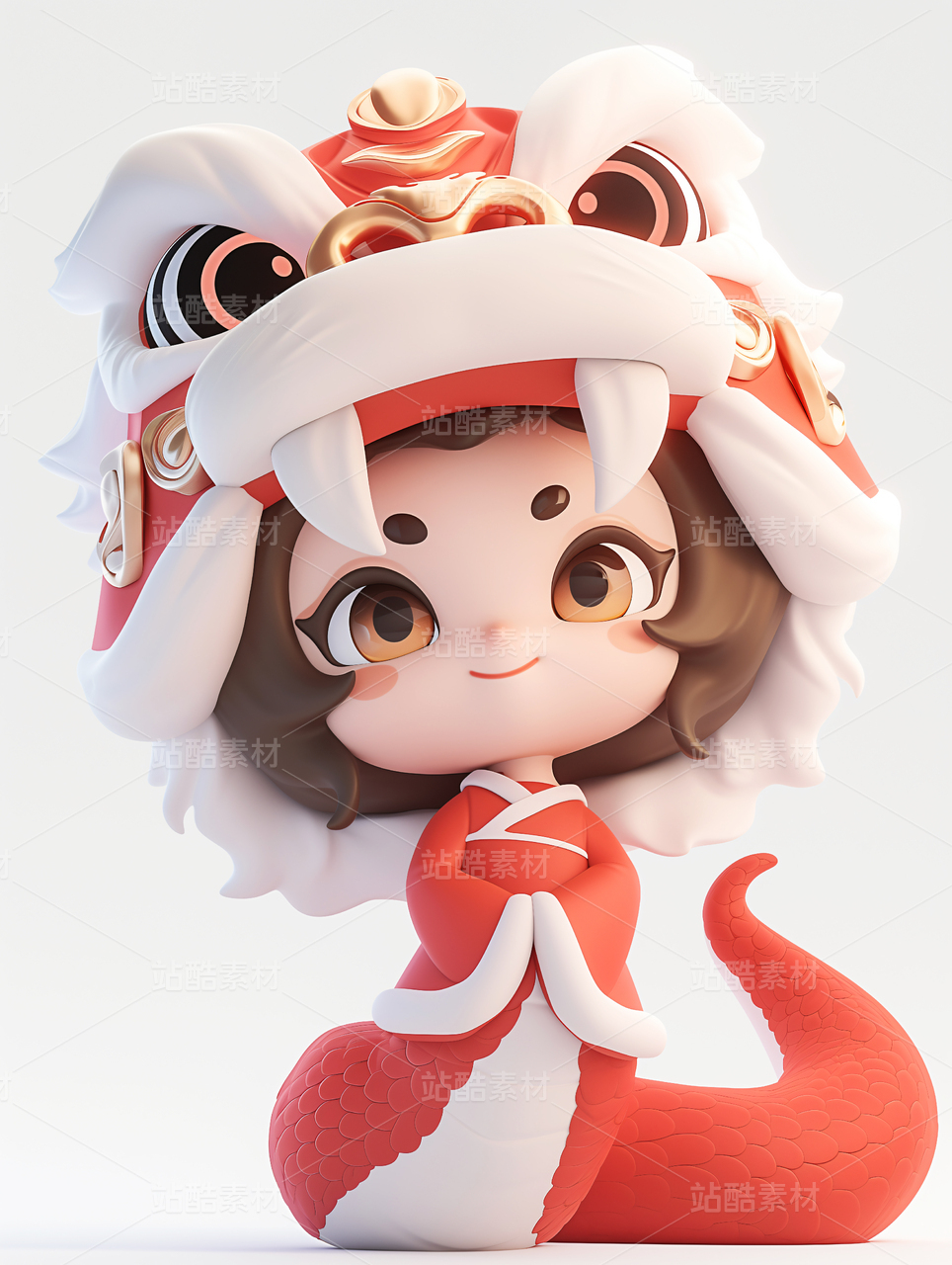 一只带着舞狮帽的红色可爱小蛇吉祥物
