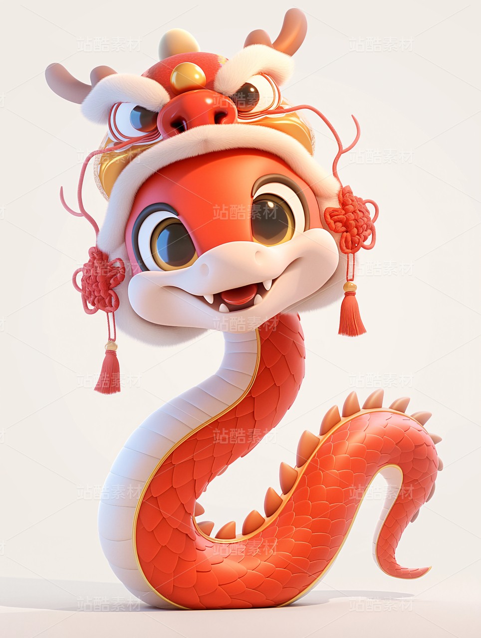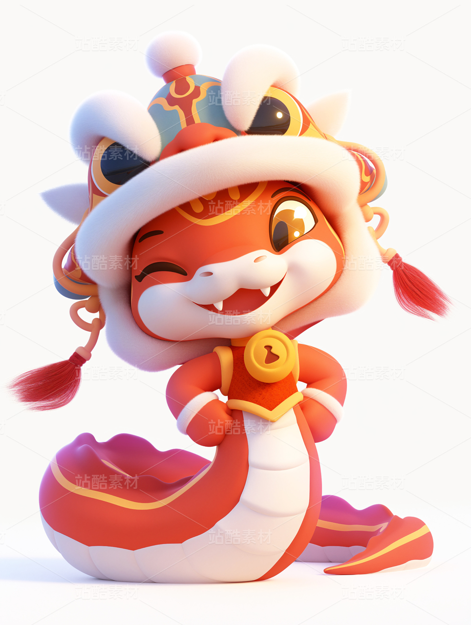 戴着舞狮帽的生肖蛇3D卡通蛇年形象