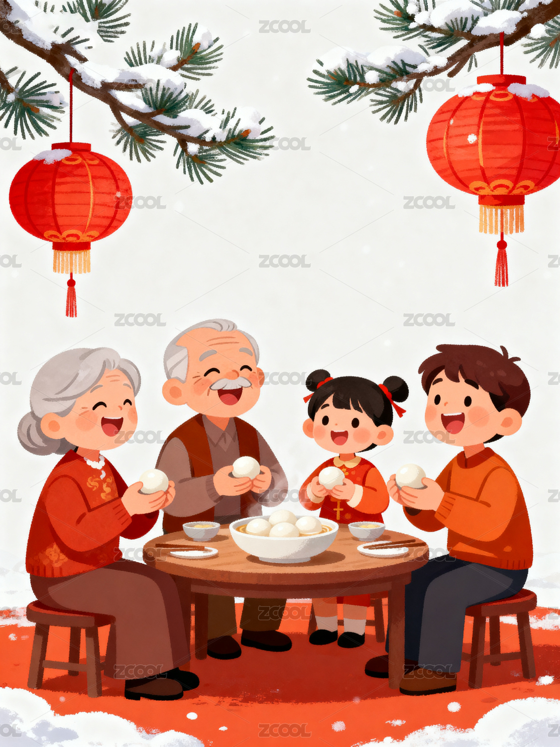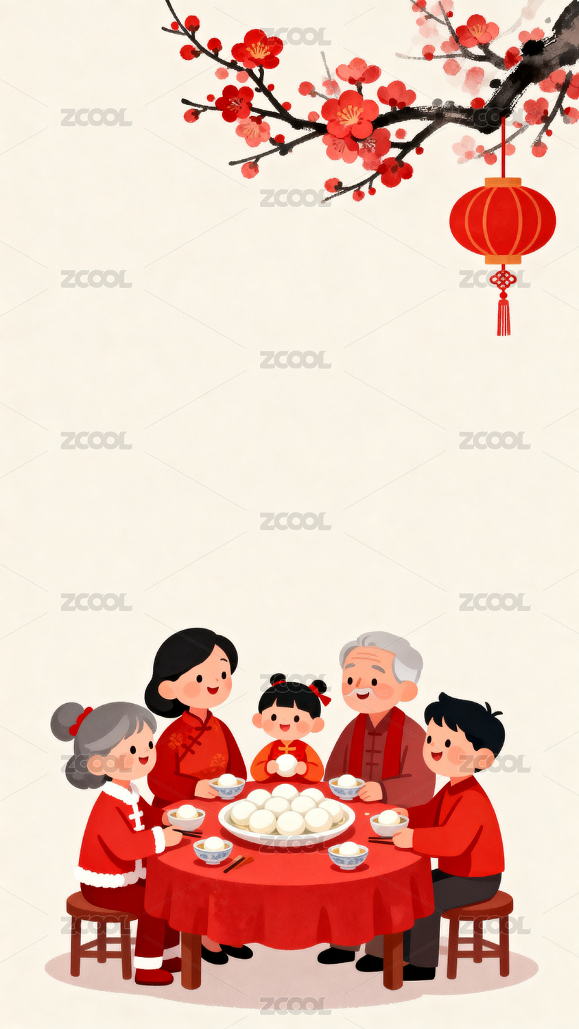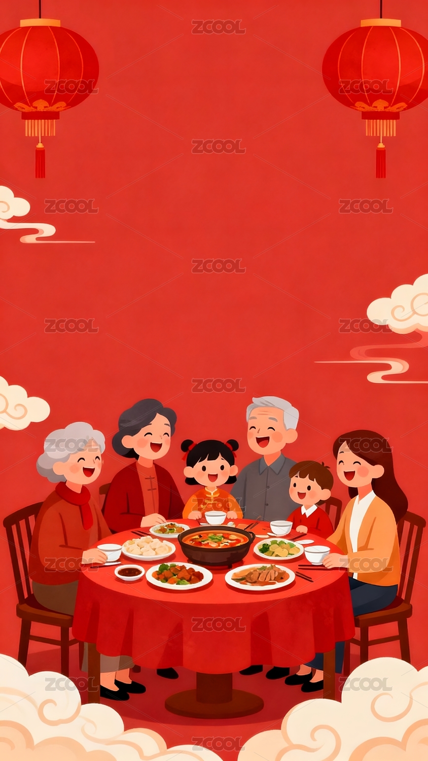 手绘中国风新年吃团圆饭的一家人竖版夜景