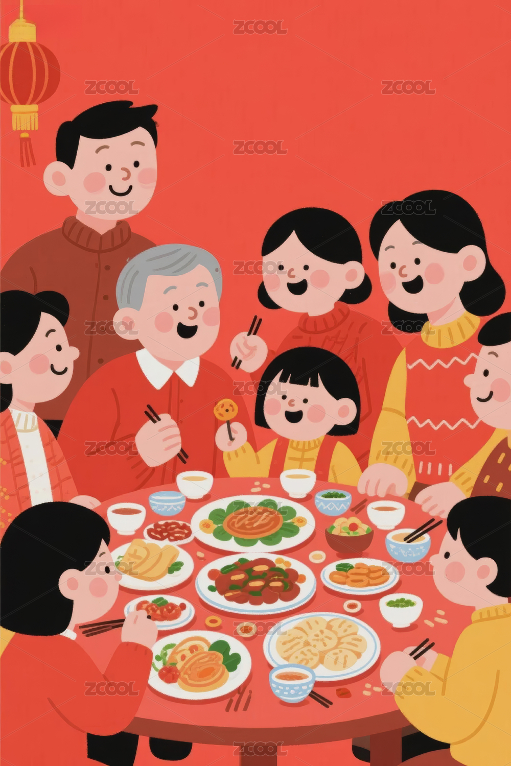 新年一家人在除夕夜吃团圆饭的年俗插画