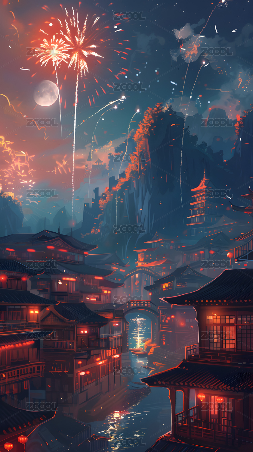 烟花国庆节春节新年中秋节节日卡通插画背景