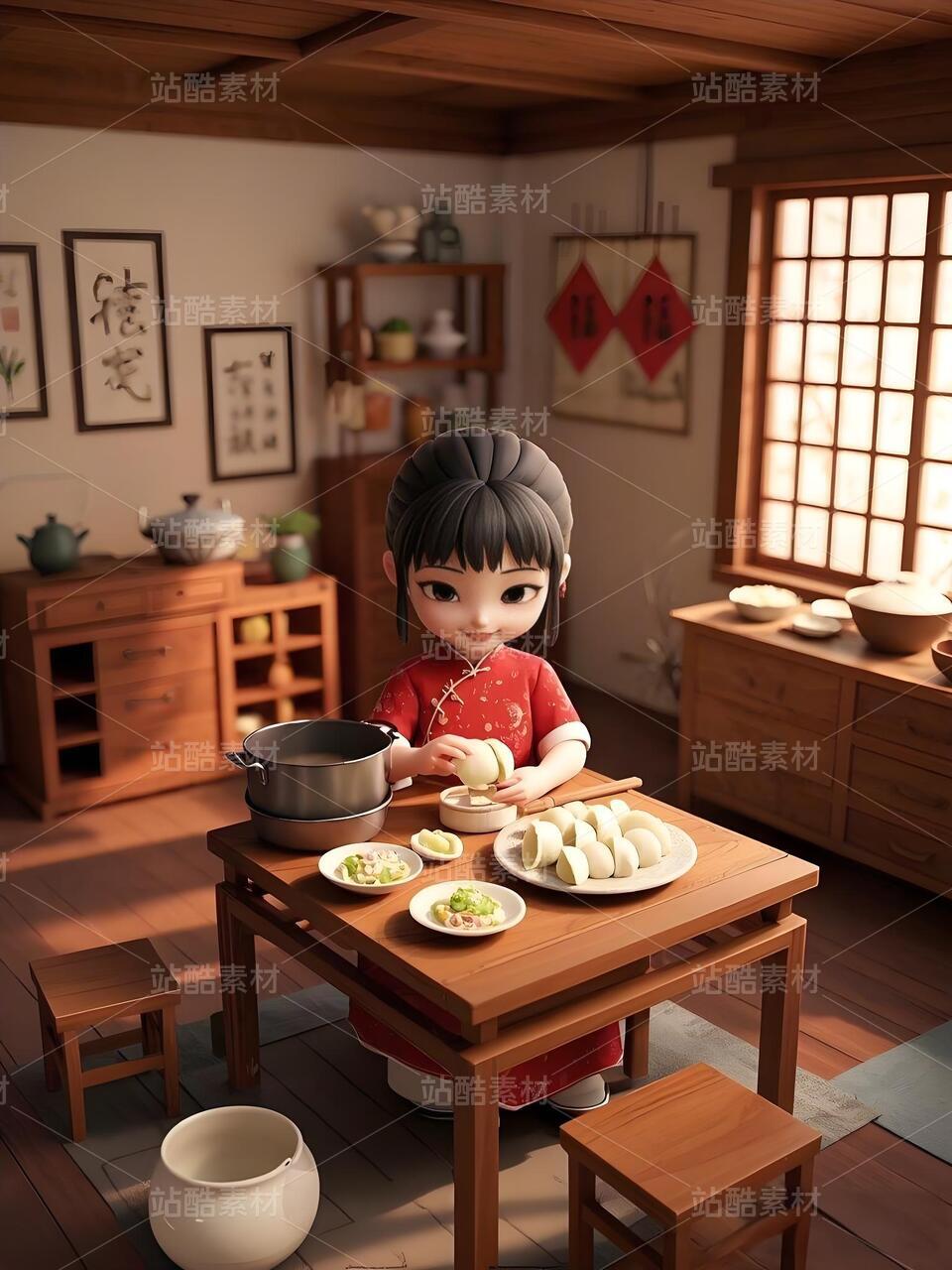 穿汉服的女孩和一个大月饼,3D人物插画