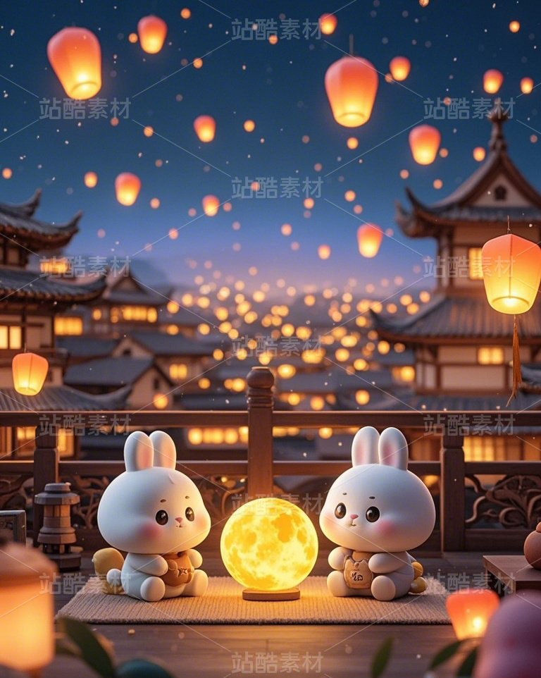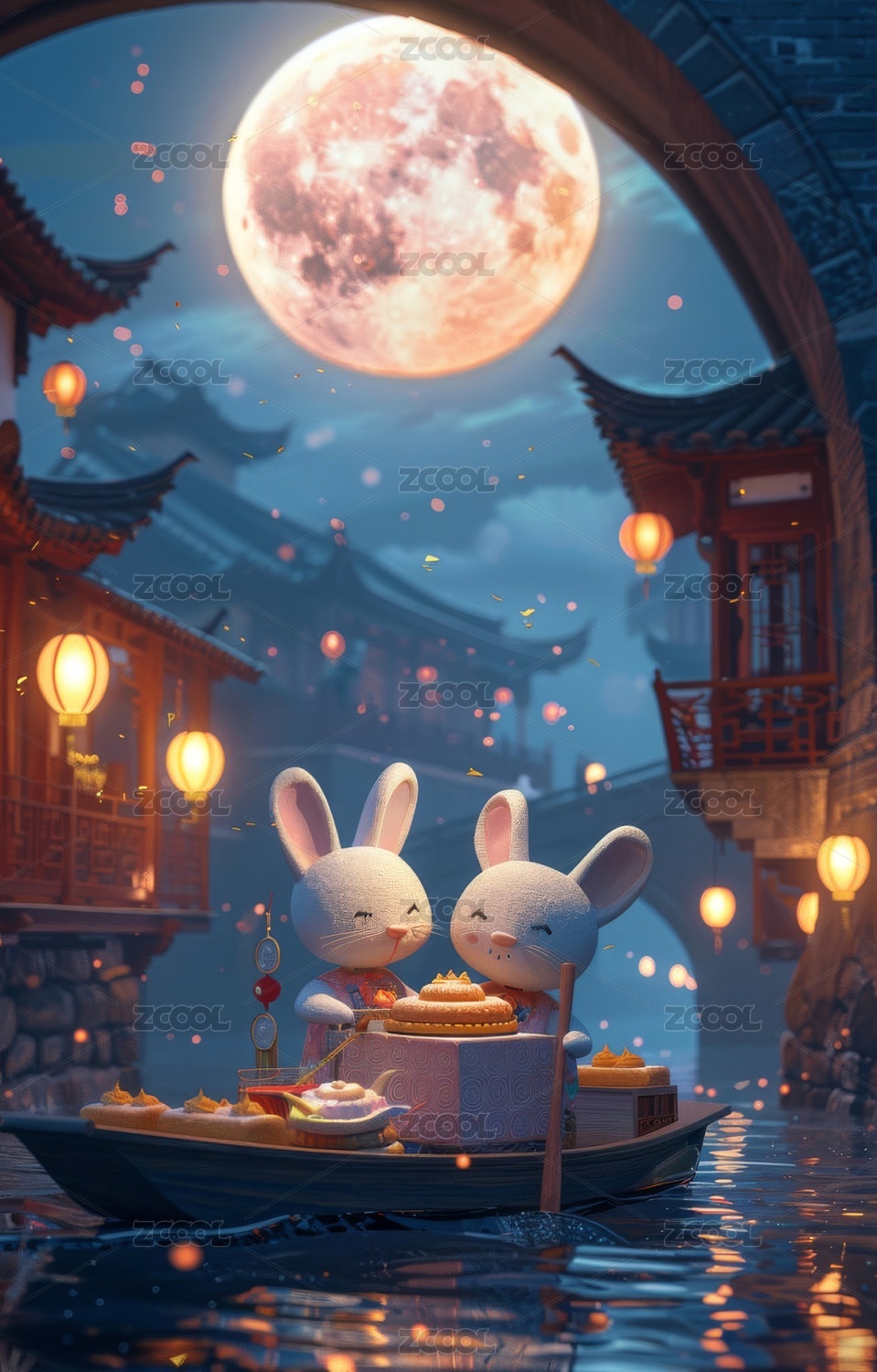 中秋节海报月饼灯笼-祥云玉兔,桂花月亮,中秋佳节