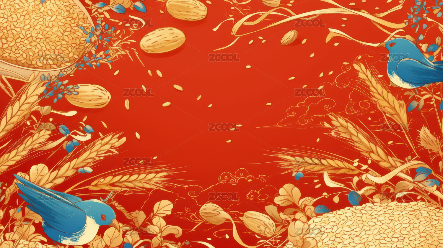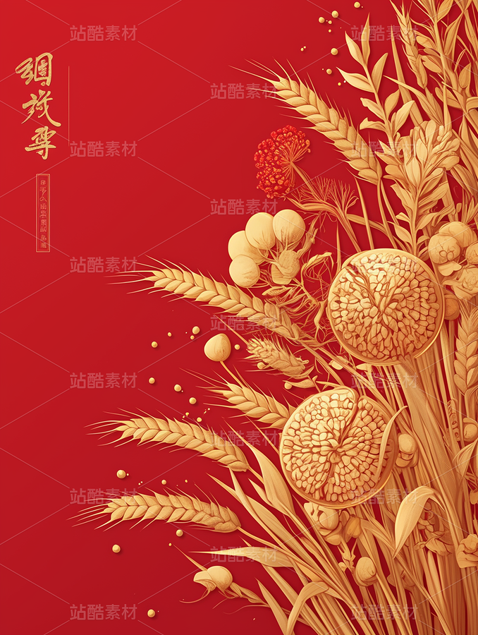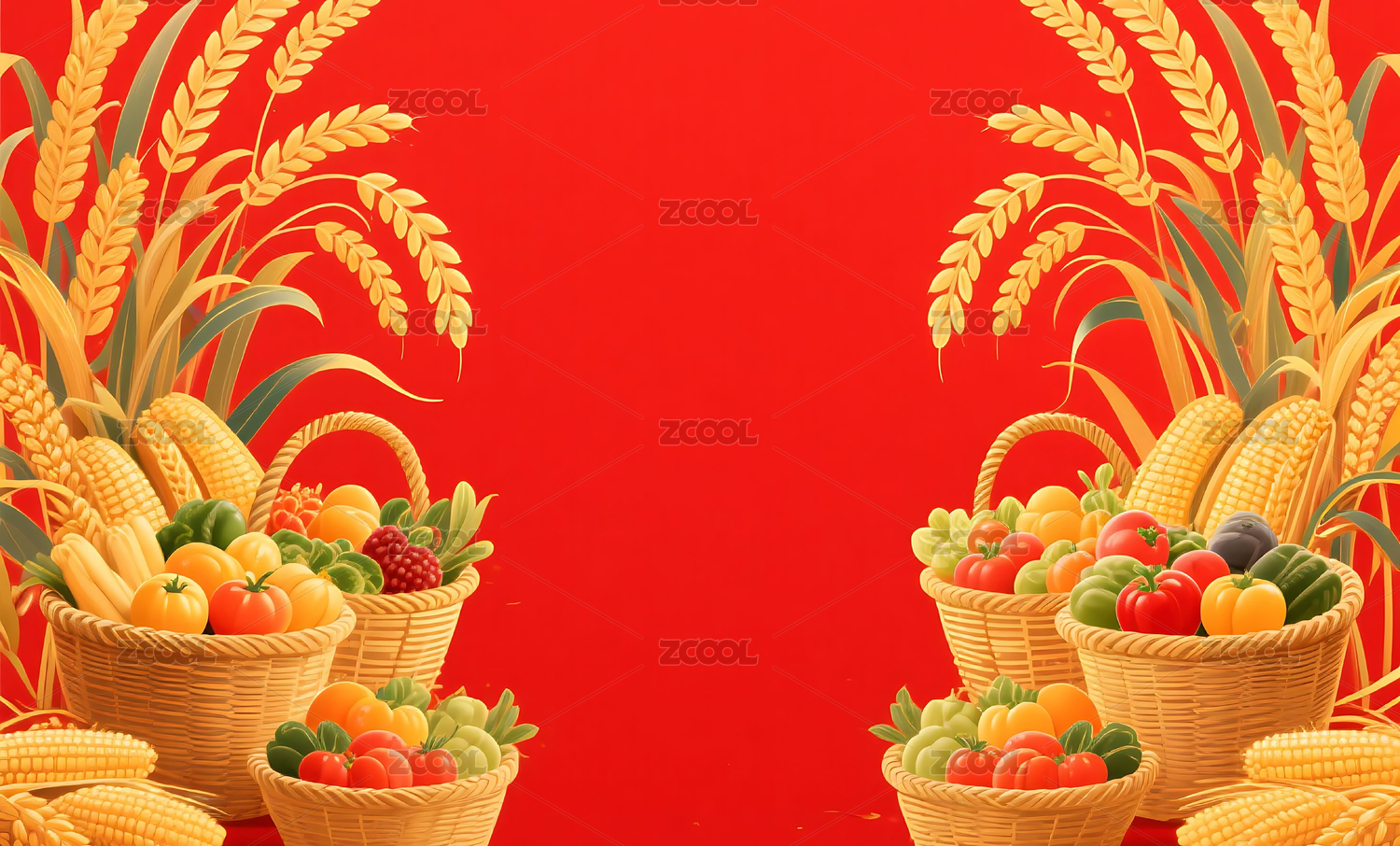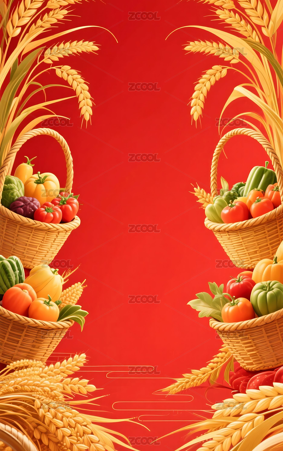 丰收的一筐筐食物蔬菜瓜果红色背景