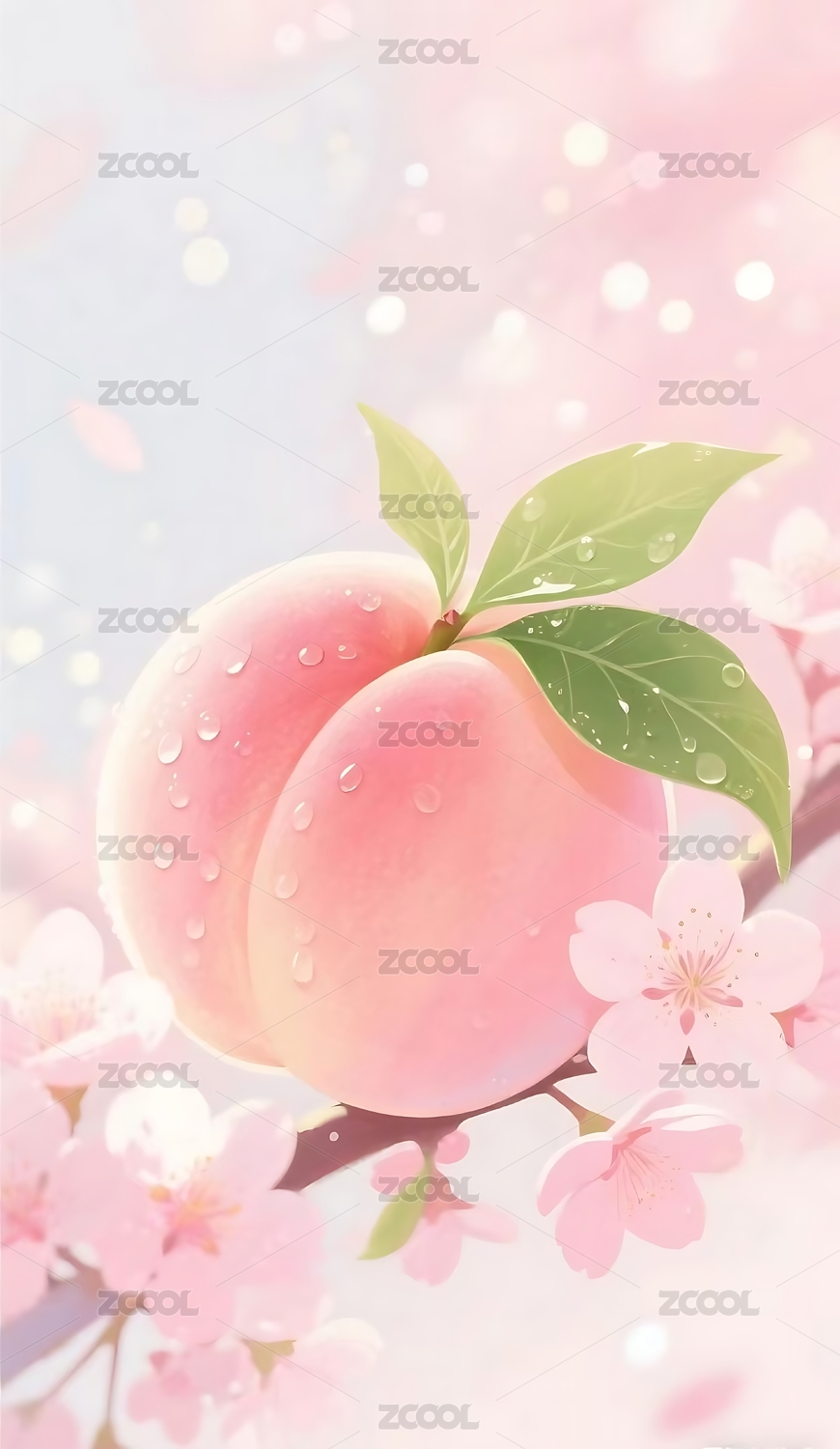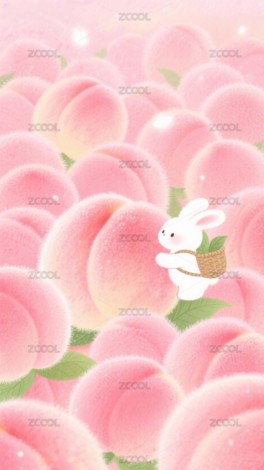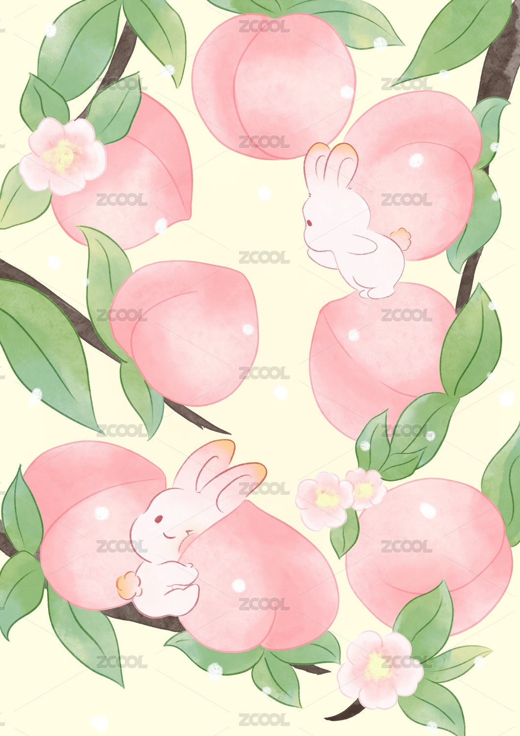 手绘插画,一只可爱的小兔子趴在巨大的桃子,简笔画,卡通,蜡笔风