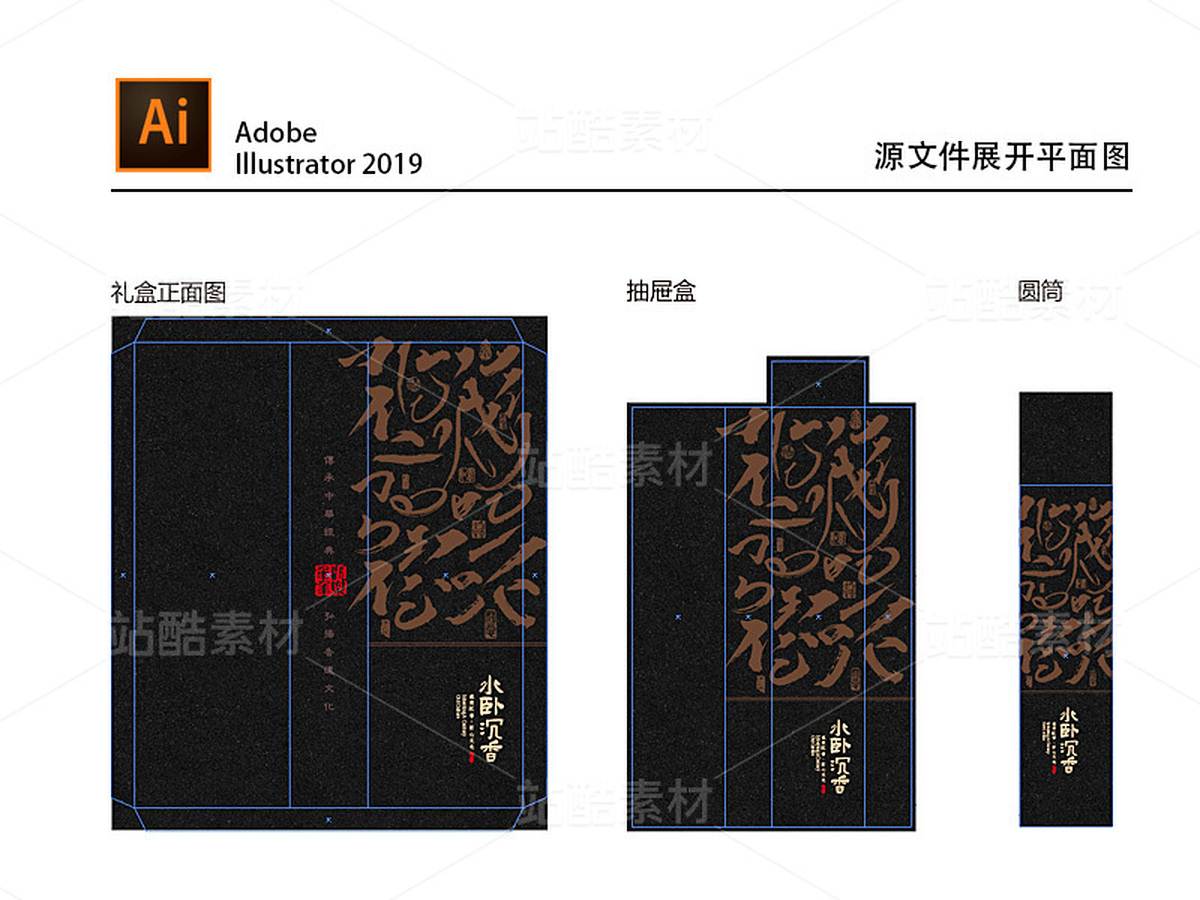 2、素材文件包含:礼盒正面展开图、抽屉盒正面展开图、圆桶展开图;
