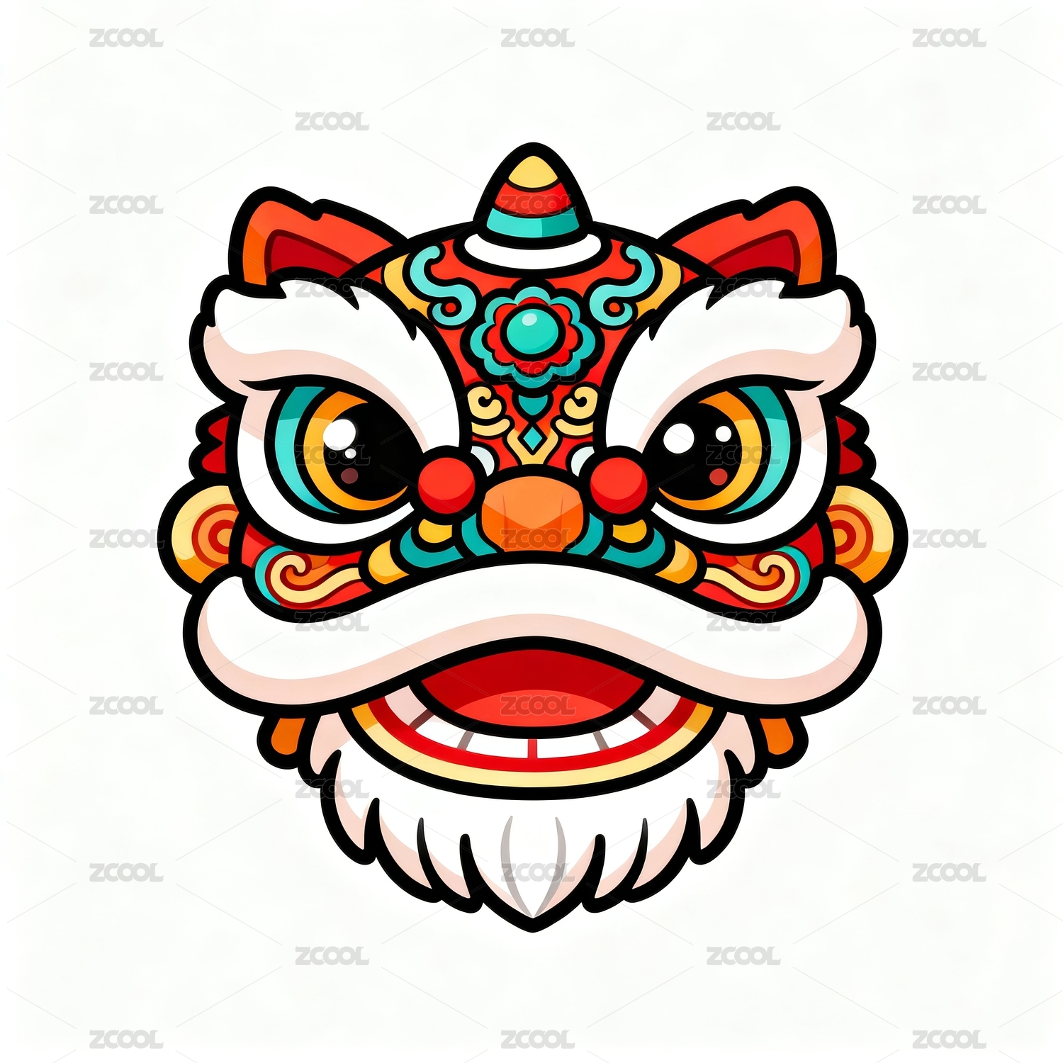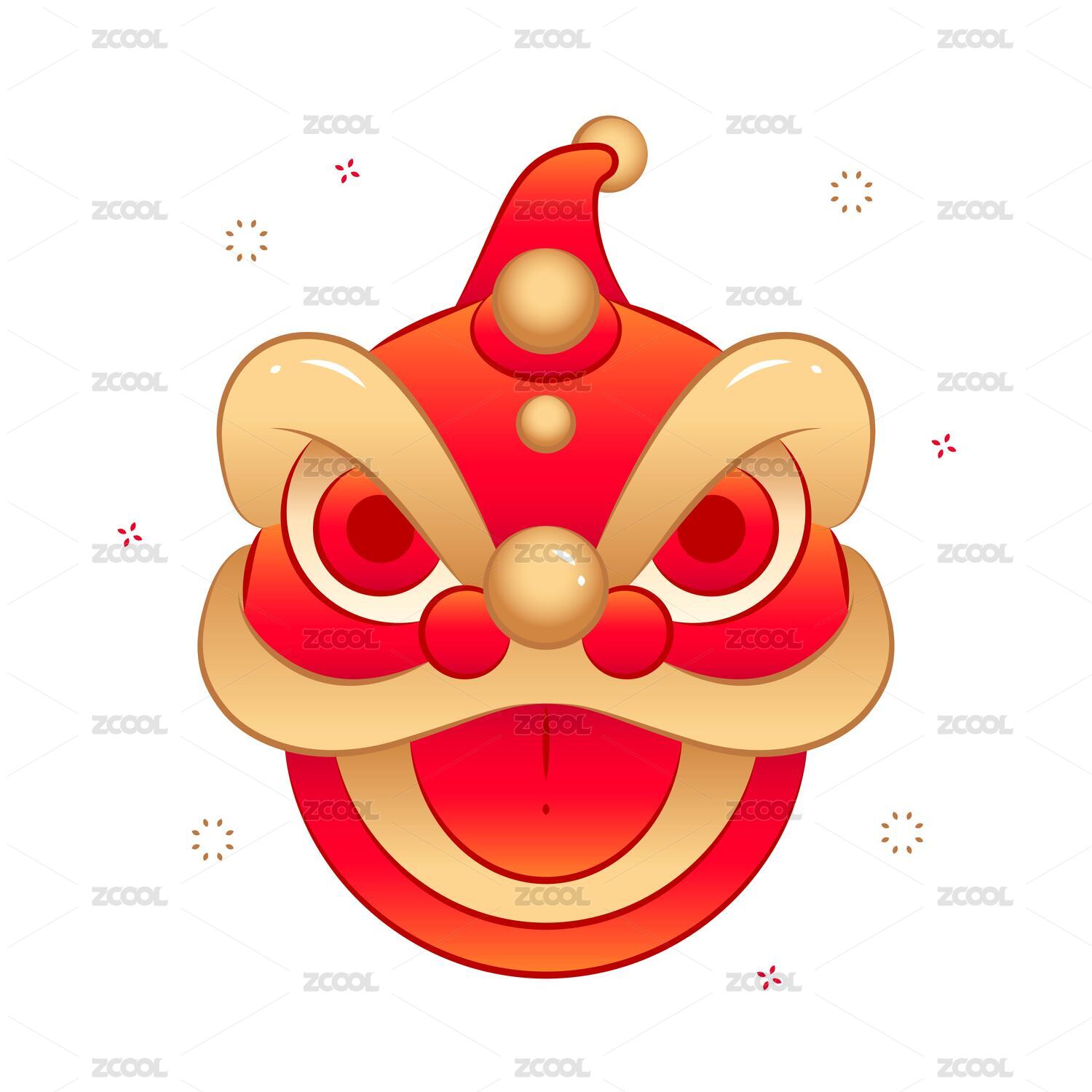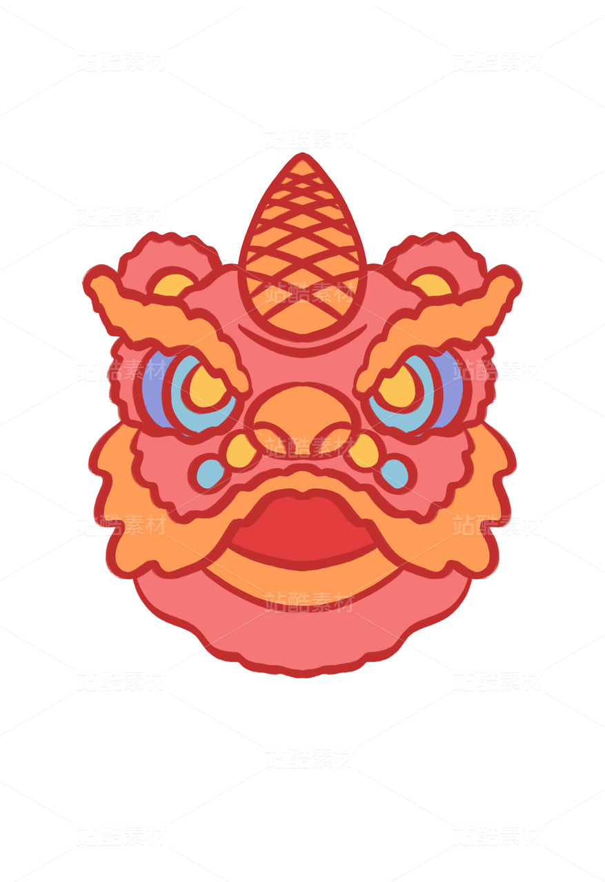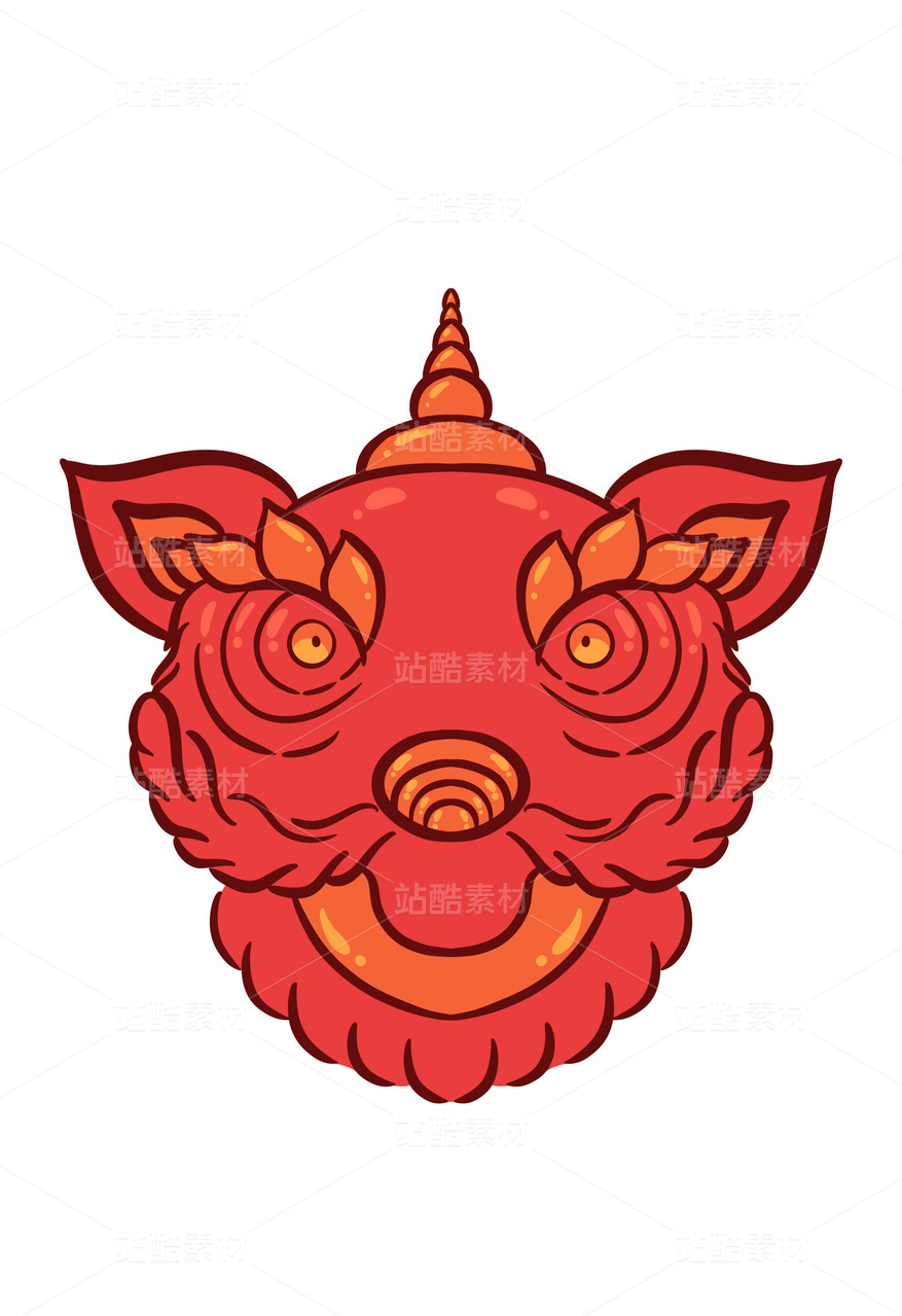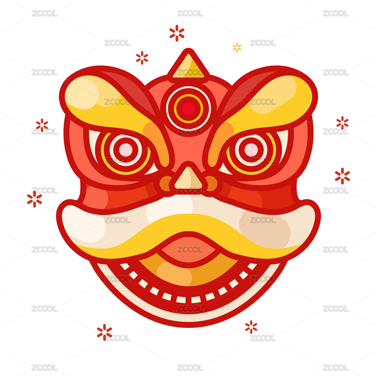 牛年春节舞狮狮子头扁平描边矢量插画图标